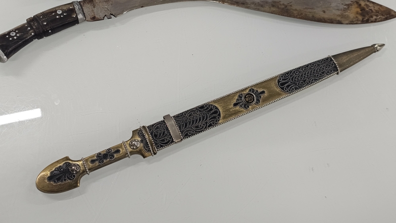 Pidempi 56cm. Kukrissa ja tupessa kulumaa