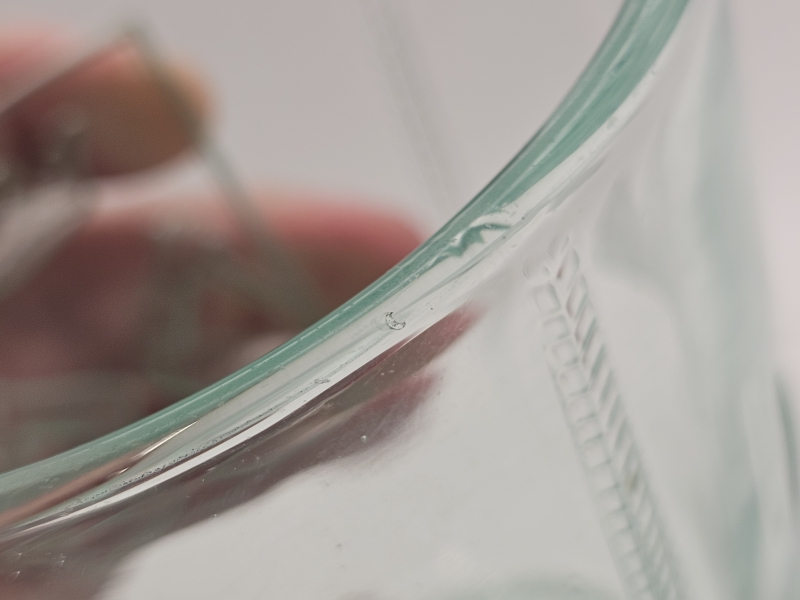 Korkeus 12,7cm. Reunassa puhjennut kupla