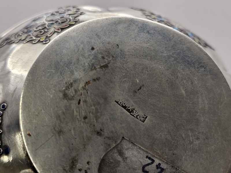 #1815 Poikkeuksellisen näyttävä hopeinen signeerattu itämainen maljakko emali- ja luukoristeilla, 1800-luku, provenienssi: Remu Aaltosen kokoelmasta