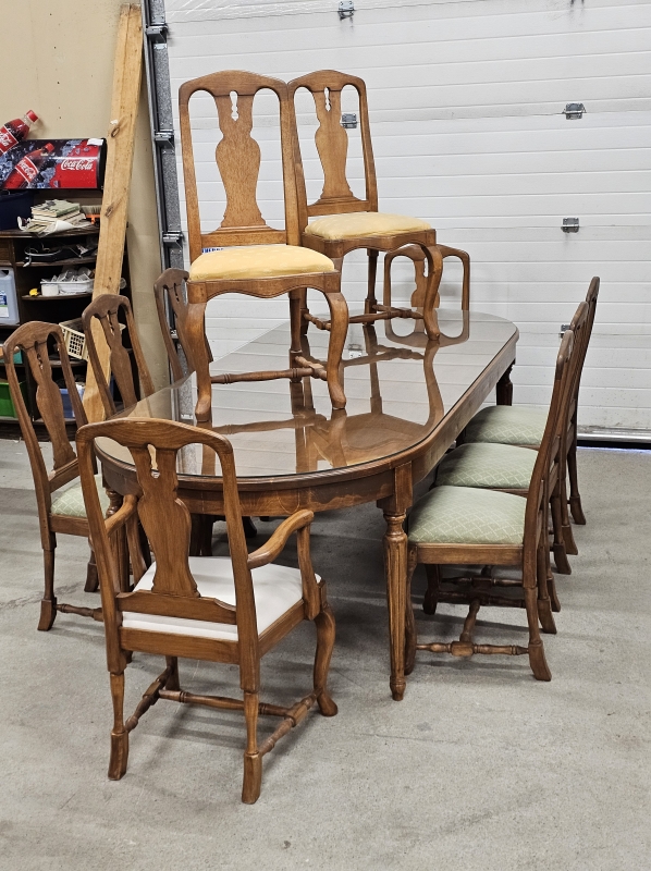 Osassa eri verhoilu. Pöydän päällä lasi jonka alla pinta hyvässä kunnossa. 250cm x 105cm, 77cm