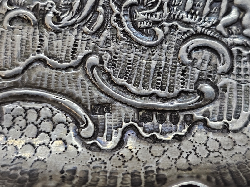 #1186 Hopeinen hieno saksalainen pieni tarjotin jossa tuontileimat Thomas Glaser, Lontoo v. 1892
