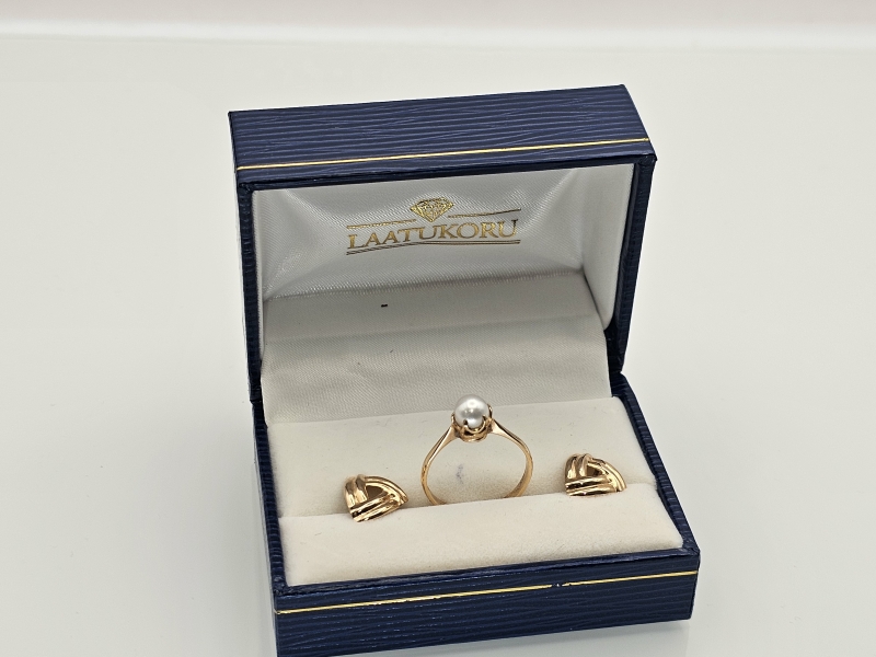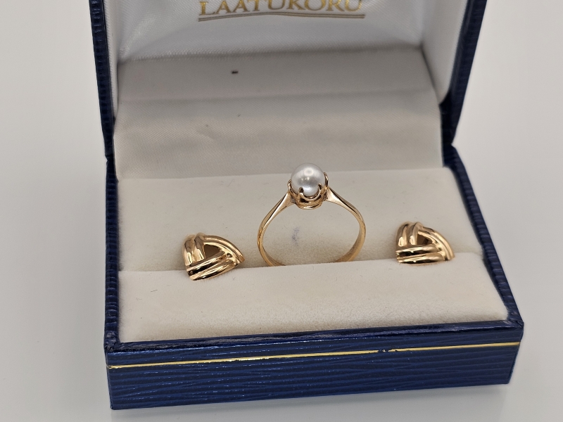 #1576 14k kultainen sormus helmellä ja korvakorut, 2,44g