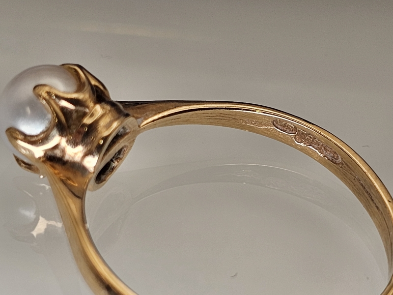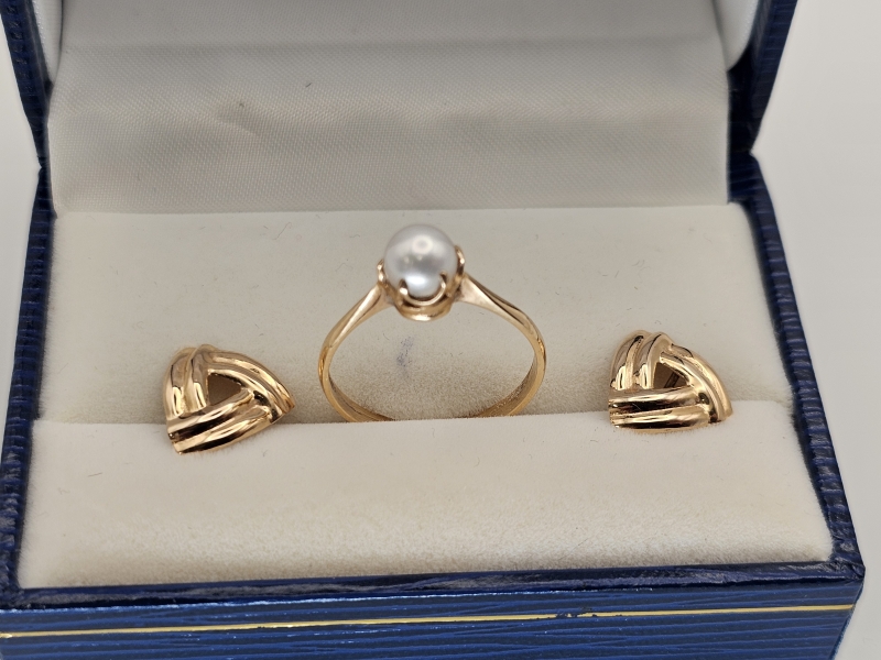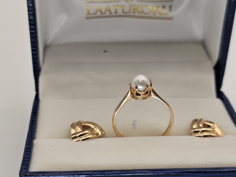 #1576 - 14k kultainen sormus helmellä ja korvakorut, 2,44g