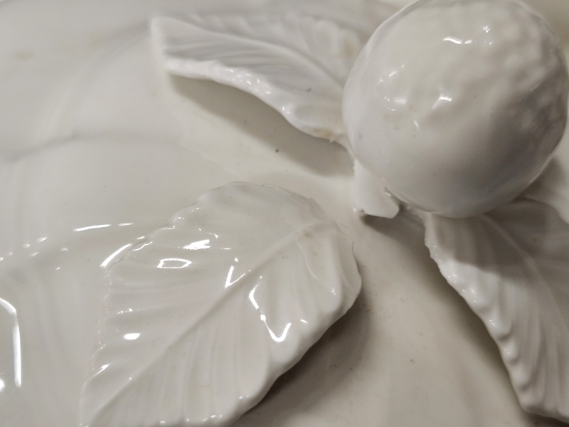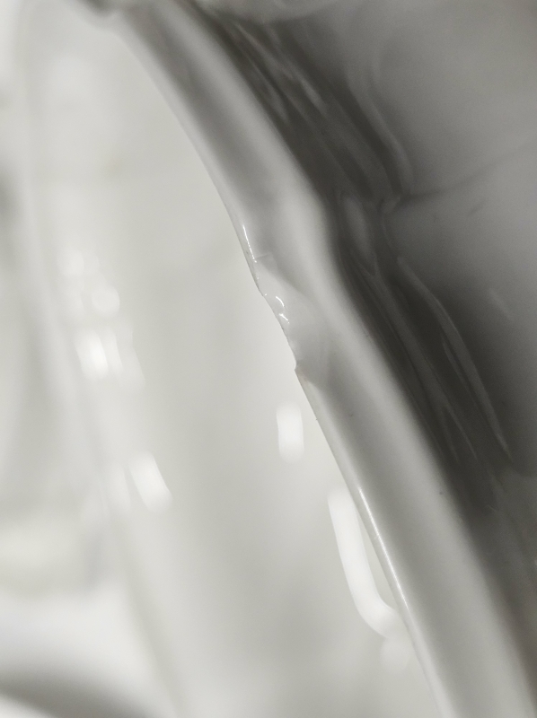 Neljässä lautasessa reunaviat, sokerikon ja pienemmän skoolin kannesta palat pois ja isoimmassa tarjoiluvadissa pala pois. Myös kahdesta tarjoilukulhosta palat pois