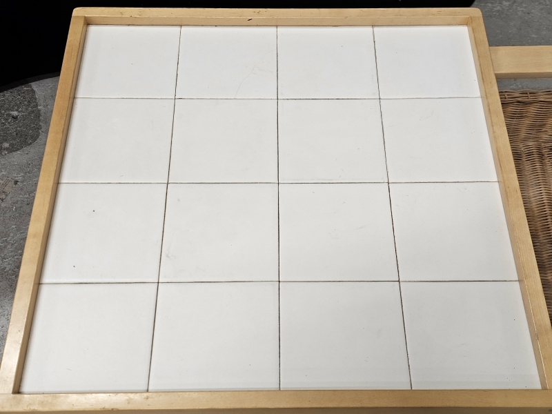 Käyttökulumaa, yhdessä kaakelissa hiushalkeama. Pyörien maalissa puutteita. 92cm x 63cm, k: 59cm