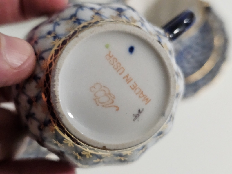 #731 Lomonosov verkkokuvio astiastoa + pieni kannu + Arabia riisiposliiniastioita