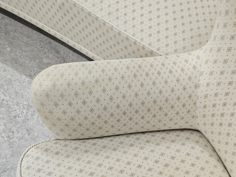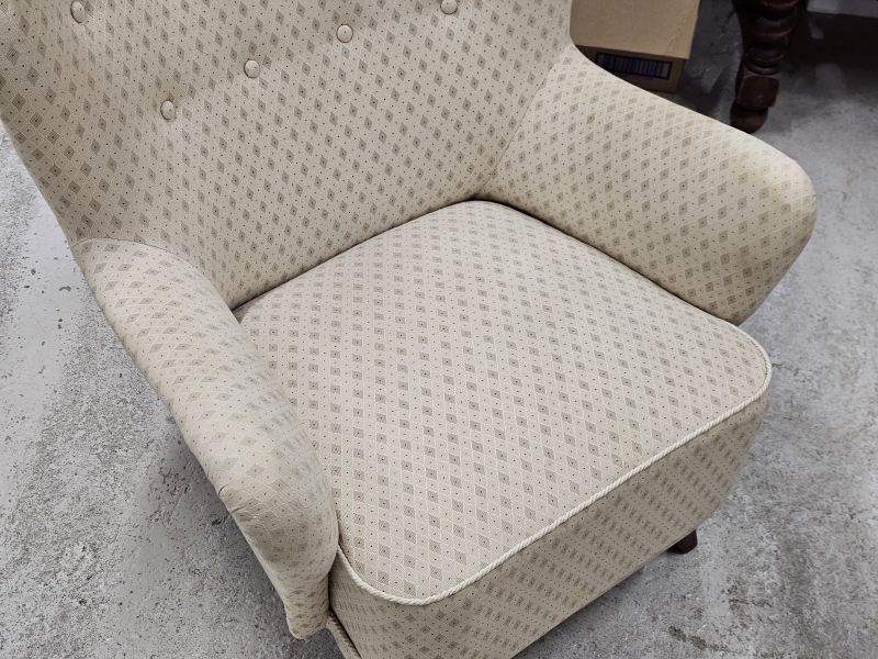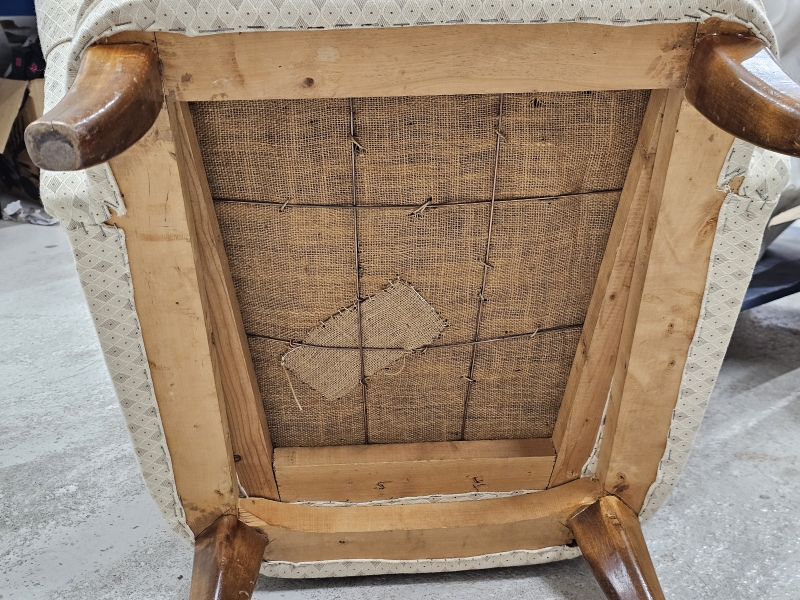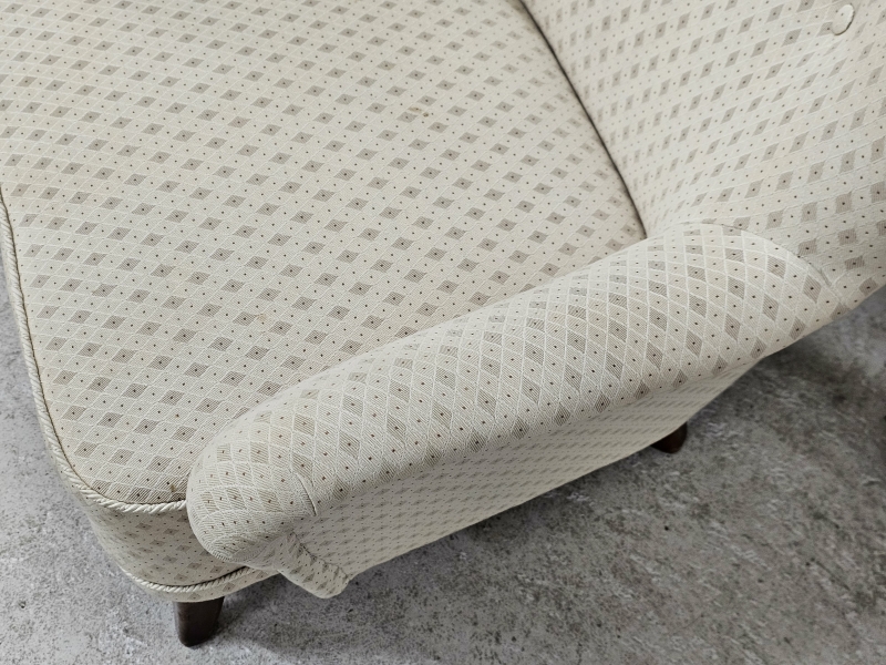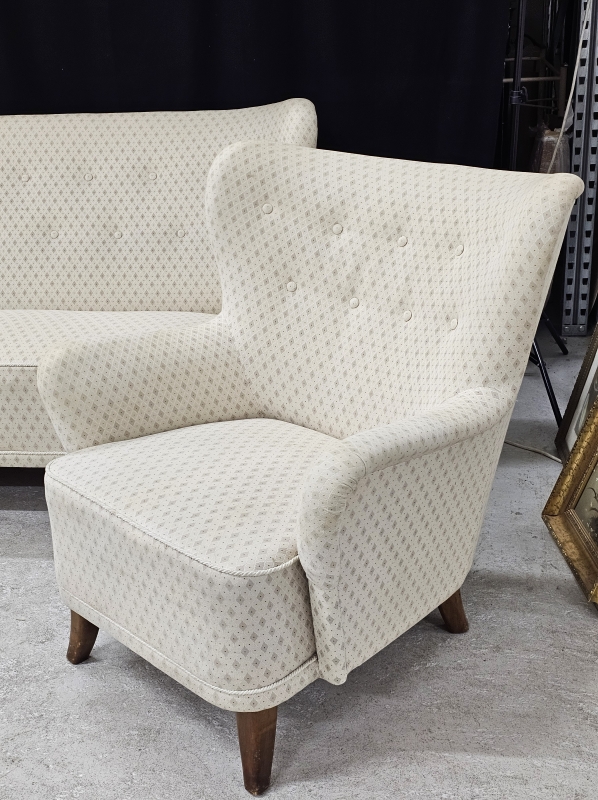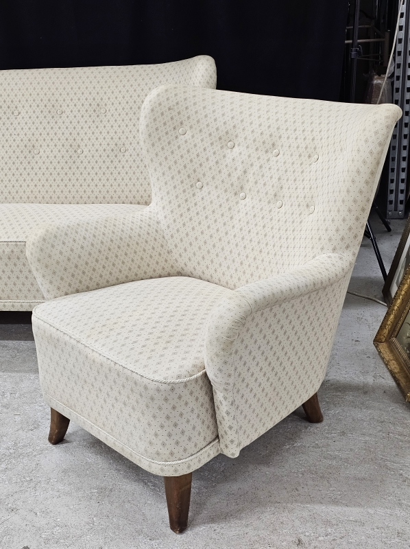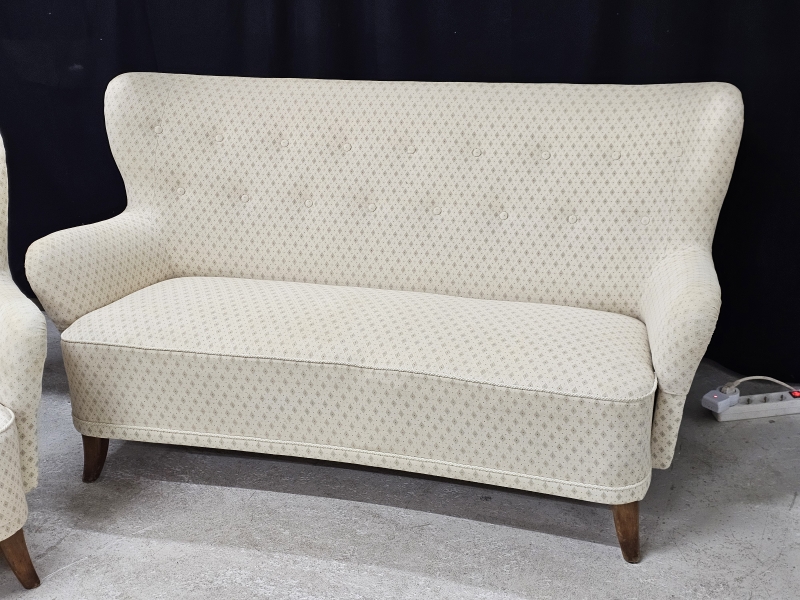 Sohvasta yhden jousen kiinnitys pettänyt. Myöhempi verhoilu. Jaloissa kulumaa, sohvan istuimessa pieni tahra, käsinojissa käyttökulumaa