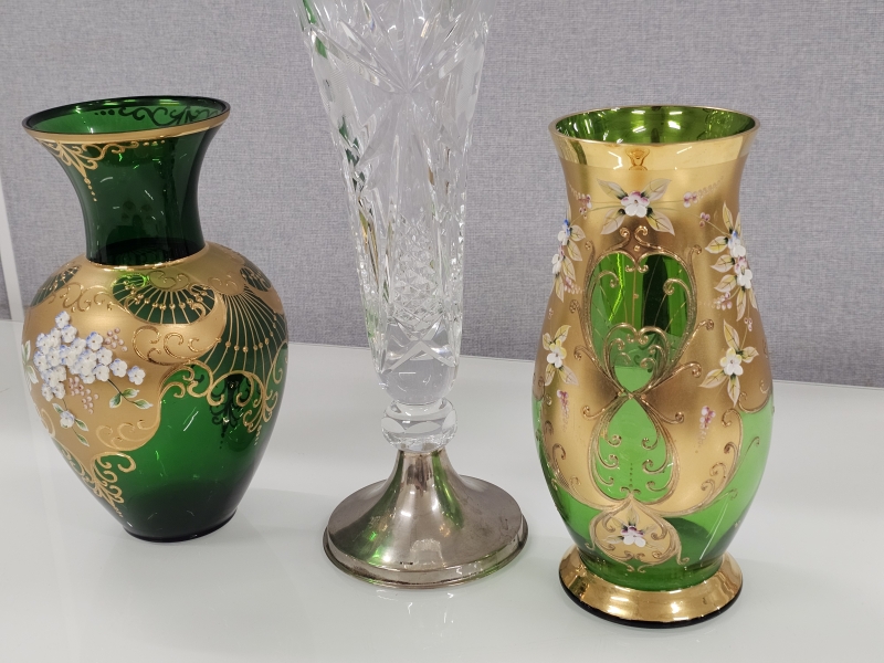 #124 - Kristallimaljakko hopeajalalla + 2kpl Murano / Bohemia maljakoita kultauksella