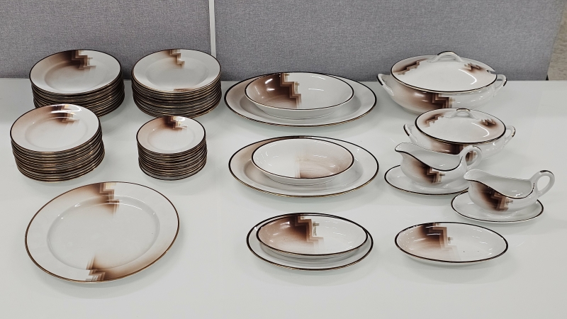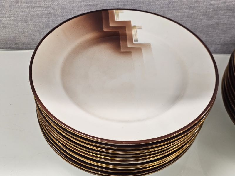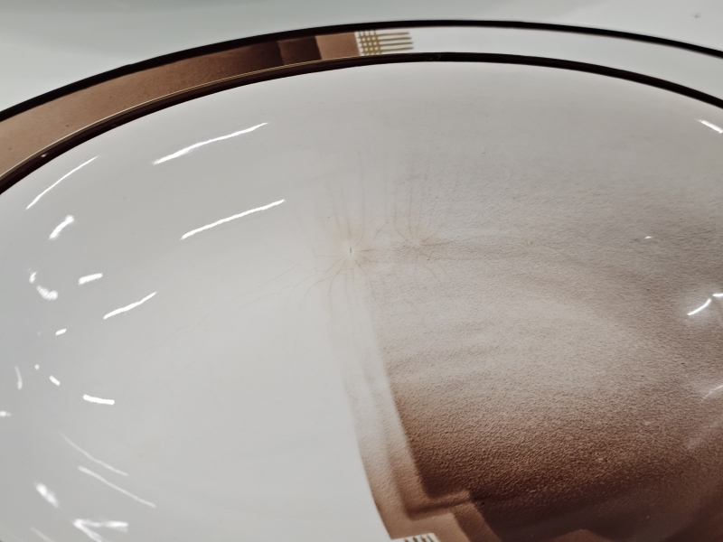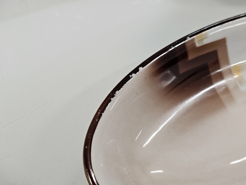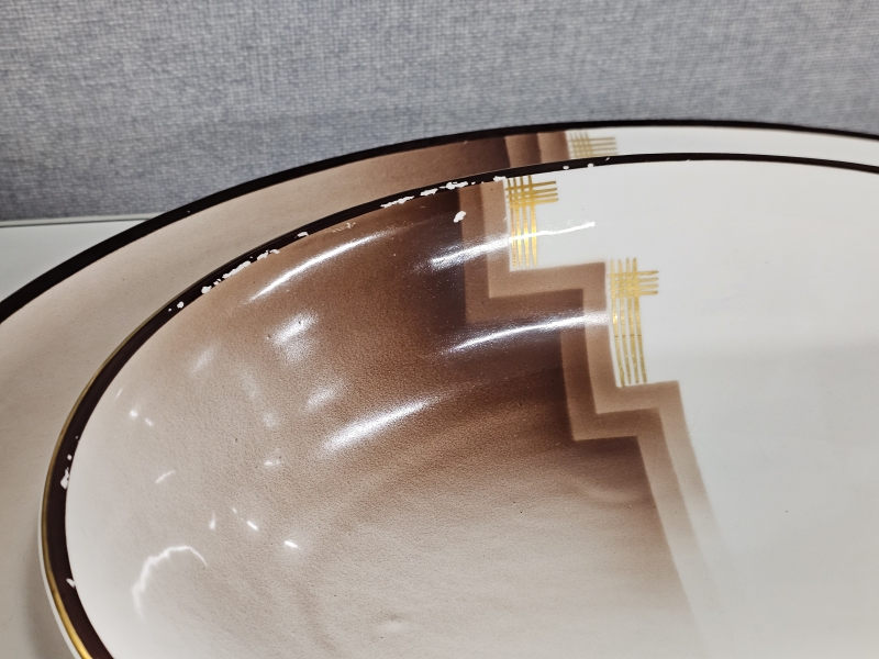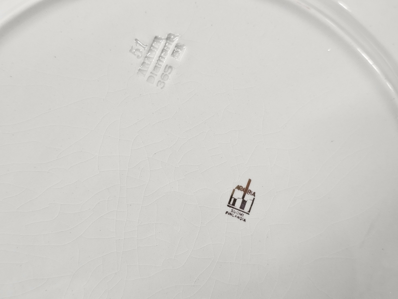 Osassa lasitteessa kulumaa ja krakeloitumaa, osa ikäisekseen erittäin hyvässä kunnossa. Ei paloja pois.