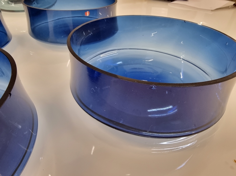 Isossa kulhossa muutama reunavika, pienissä i-sarjan kulhoissa reunavikoja. Isoimman halk.: 15cm
