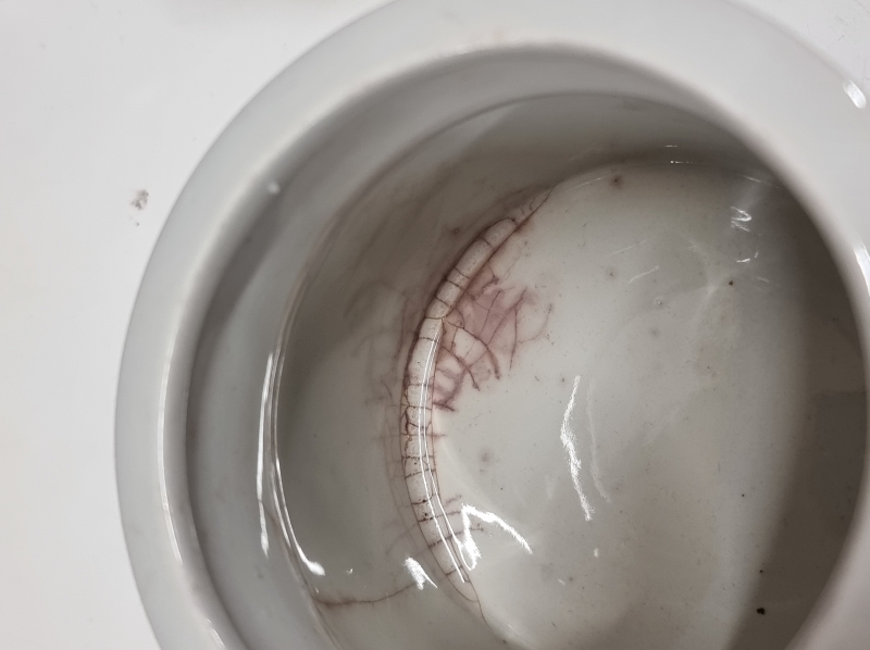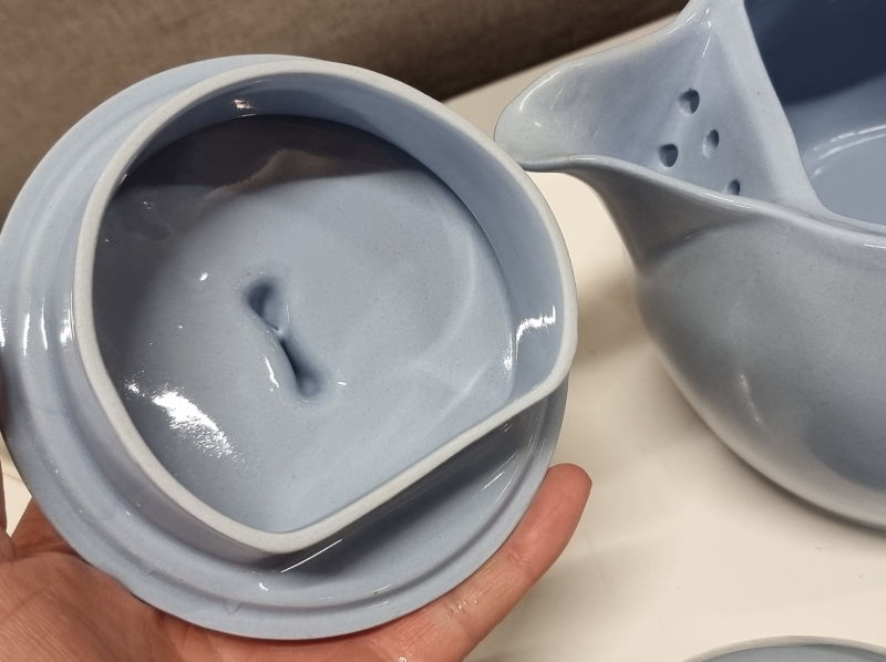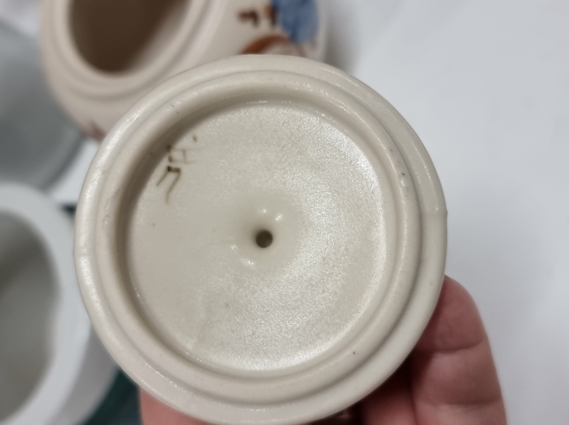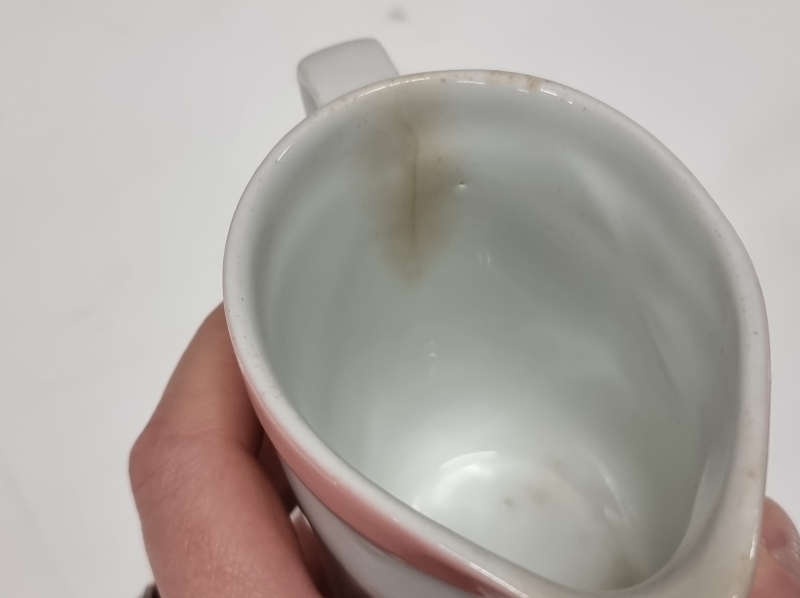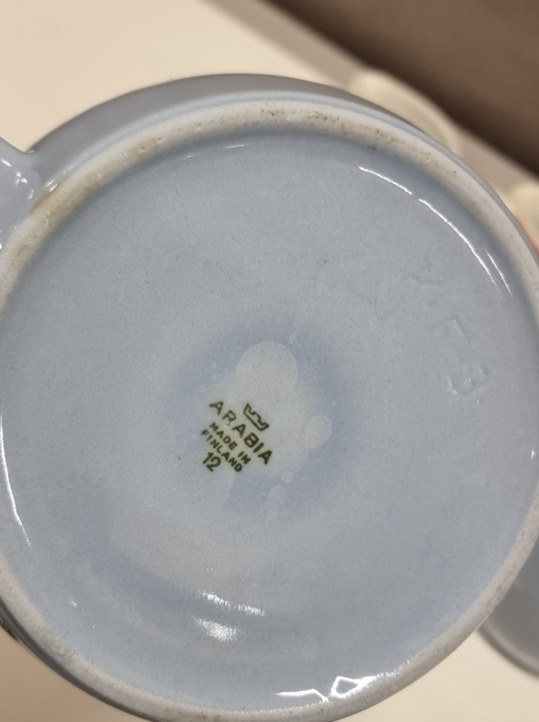 Mm. KF3 kannut. Maitokannun nokasta pala pois, purnukan pohjassa krakeloitumaa ja värjäytymää. Korkeimman k: 12,5cm