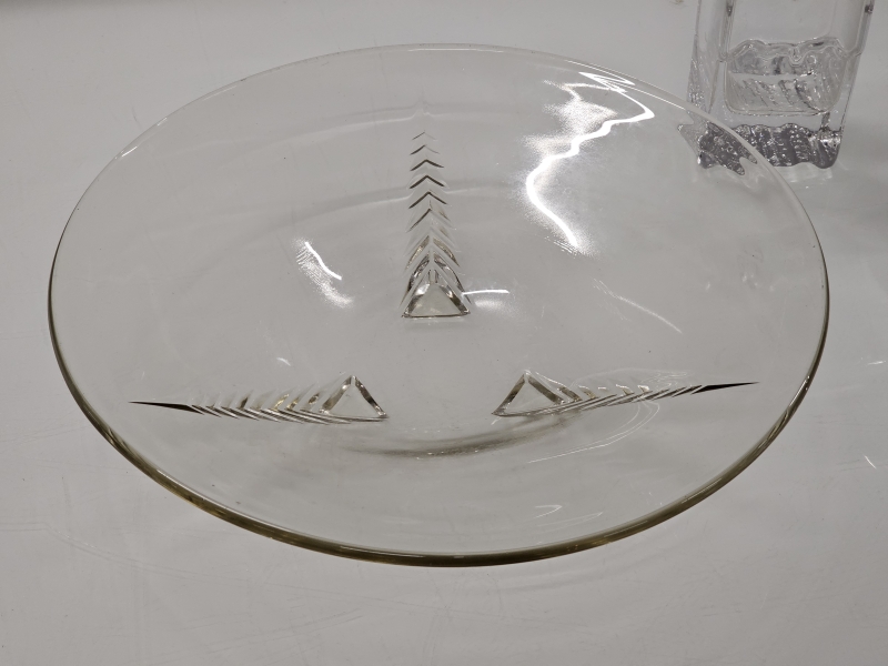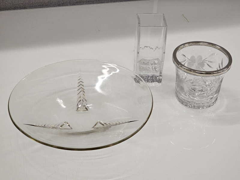 #299 - 3kpl lasiesineitä: Aimo Okkolin hopeapannalla, Wirkkala & art deco malja ym.
