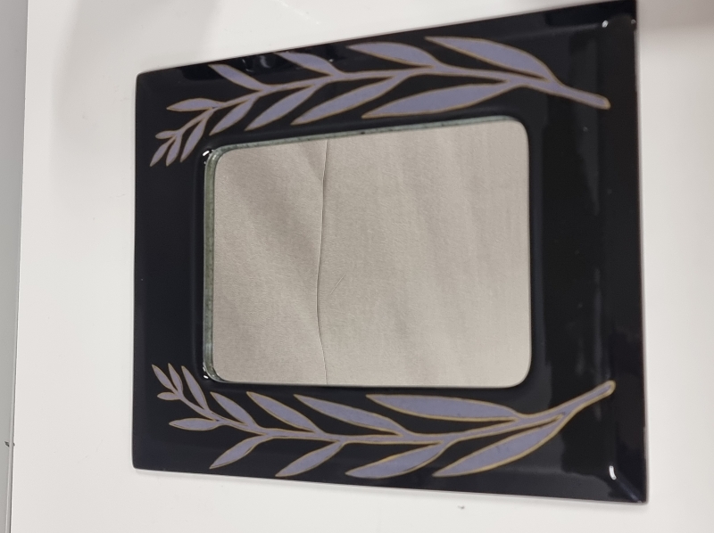 Naarmuja. Peili hyväkuntoinen ja kellossa vain pieni naarmu. Peilin korkeus 34cm.