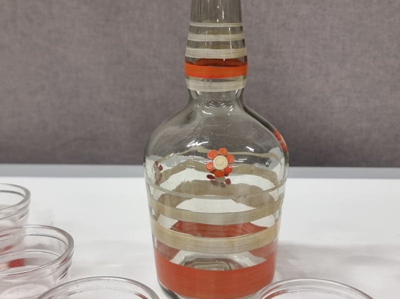 Yhdessä lasissa reunavika. Karahvin korkeus 19,5cm.