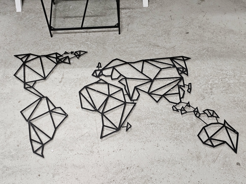 #2504 - Metallinen lasihyllykkö & abstrakti maailmankartta
