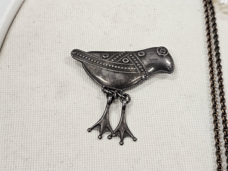 #1116 Erä koruja: Mm. Hopeinen Kalevala koru Hattulan lintu, Aarikka ym.