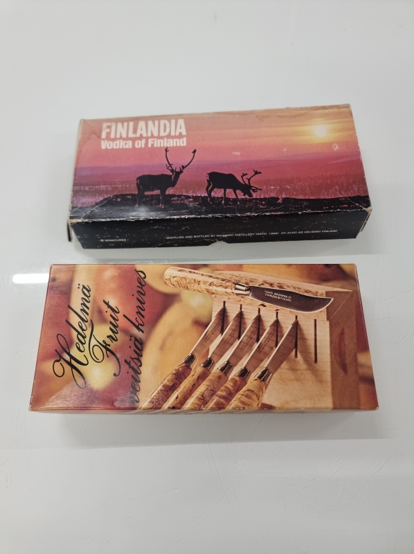 #2048 - Iisakki Järvenpää hedelmäveitset + Finlandia vodka pullot alkuperäispakkauksissa