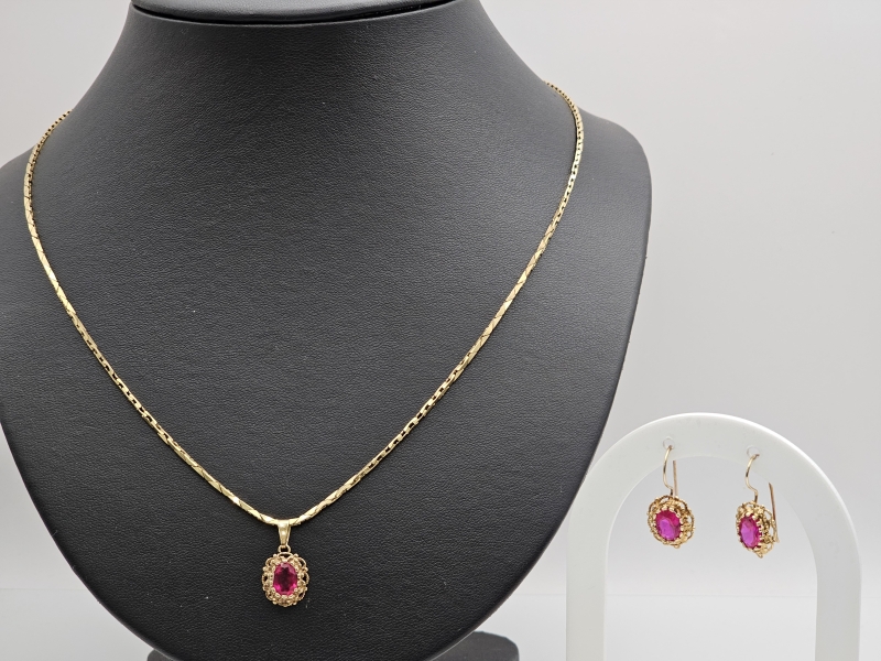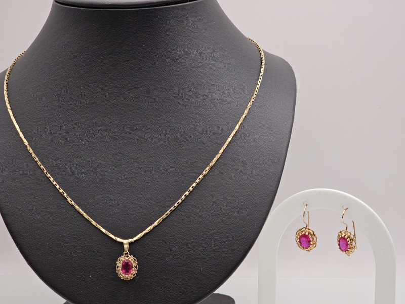 #1201 - 14k kultainen korusarja punaisilla kivillä, 10,87g