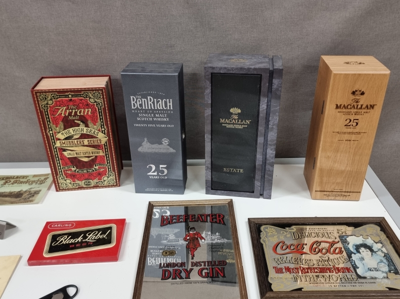 #2425 - Hyvä erä baarirekvisiittaa, mm. tyhjiä viskilaatikoita, peilejä