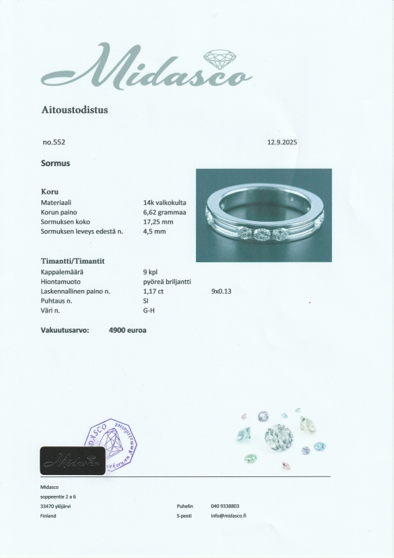 #1177 14k valkokultainen sormus 9 timantilla [yht. 1,17ct], 6,62g. Ovh. 4900€!
