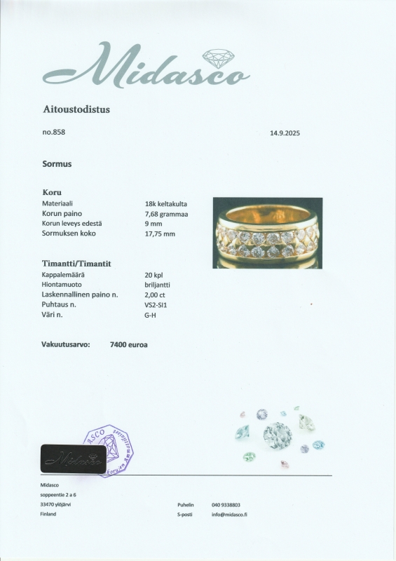 #1219 18k kultainen sormus 20 timantilla [yhteensä 2,00ct], 7,68g. Ovh. 7400e