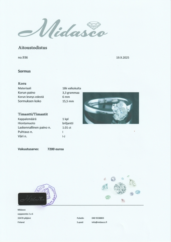 Mukana aitoustodistus vakuutusarvolla sekä uusi korurasia.