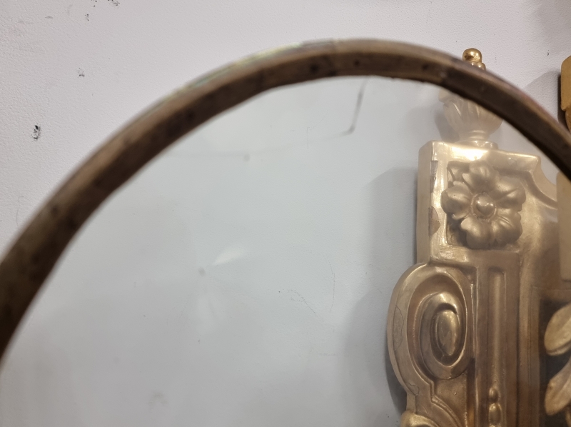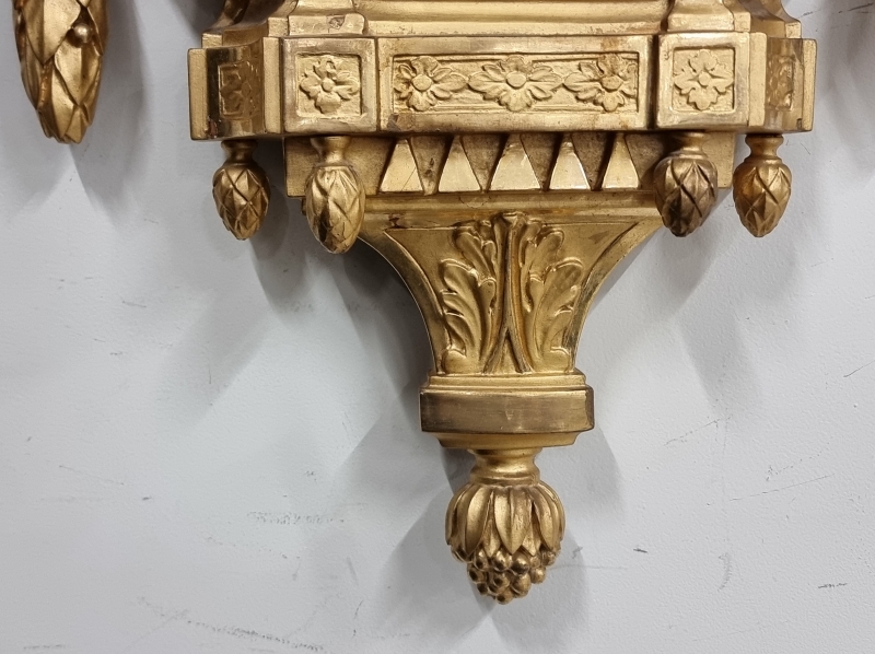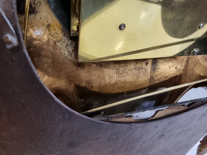 Kultauksissa kulumaa, kellotaulussa vikoja, lasi halki ja yläkoristeessa vikaa. Korkeus 93cm ja leveys 45cm.