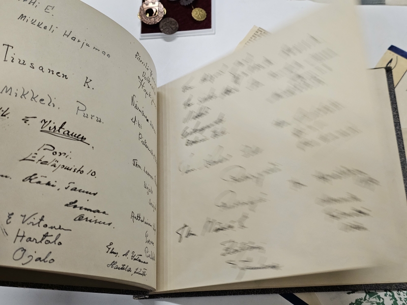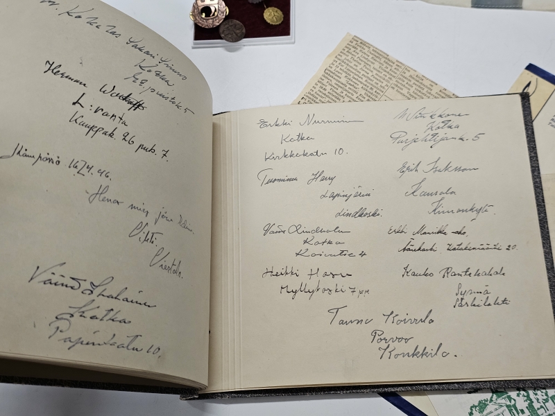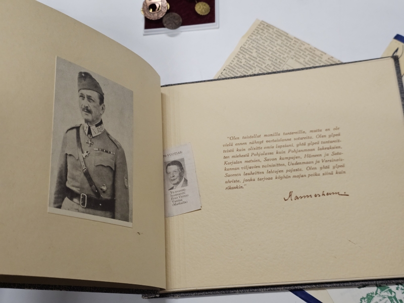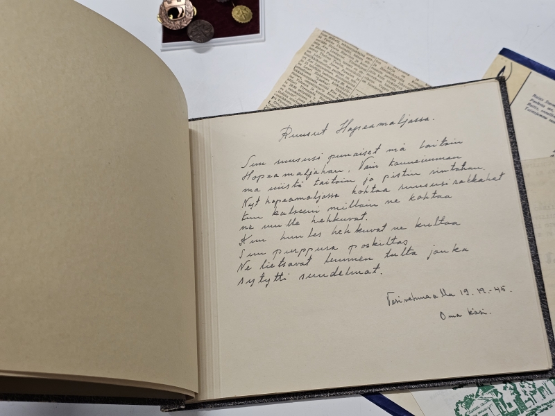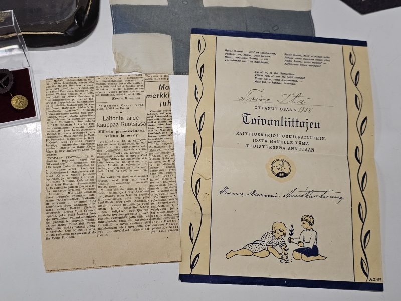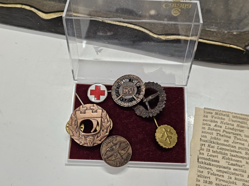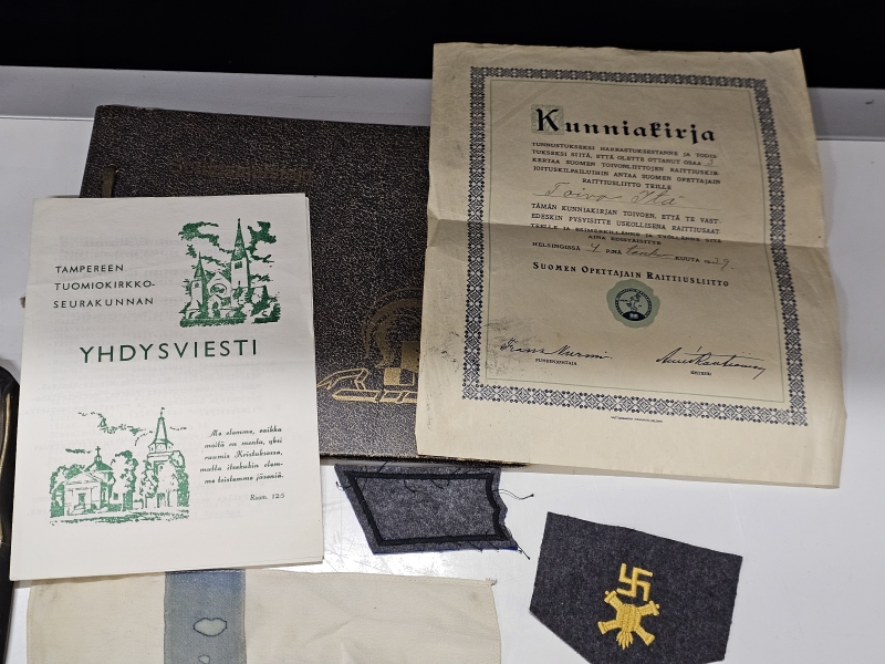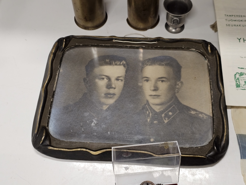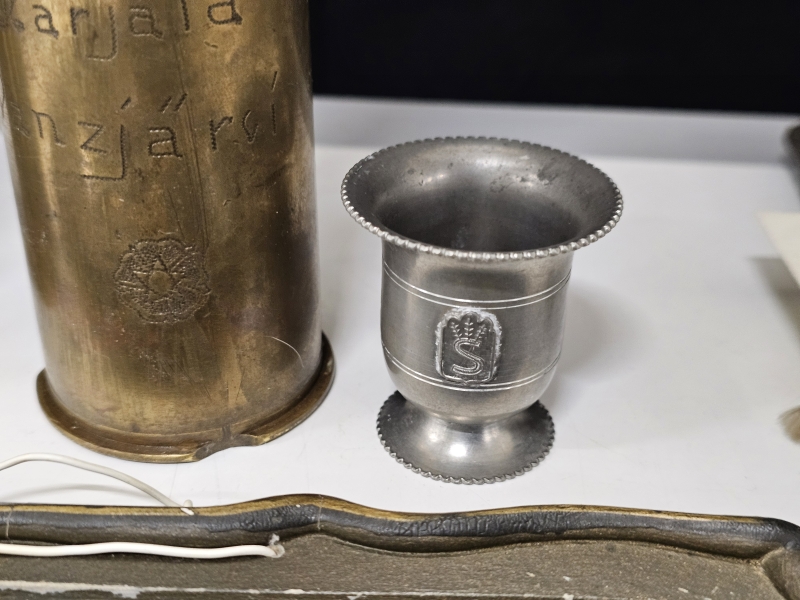 #1670 Erä sotamuistoja: Mm. puhdetyö hylsy, muistokansio, suojeluskunta tinakuppi ym.