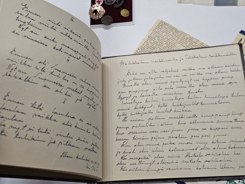 #1670 - Erä sotamuistoja: Mm. puhdetyö hylsy, muistokansio, suojeluskunta tinakuppi ym.