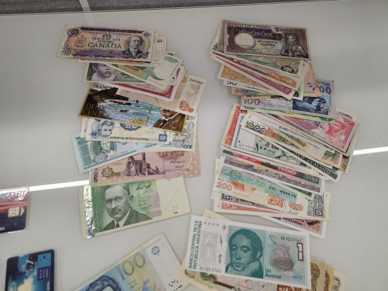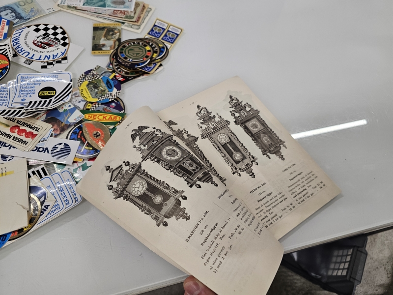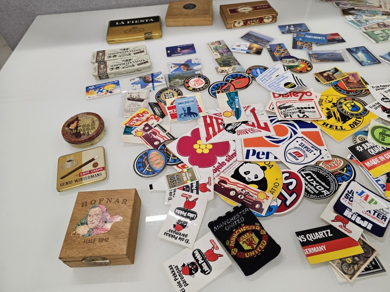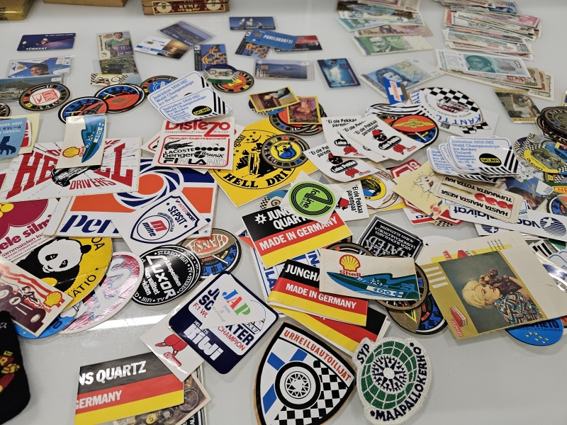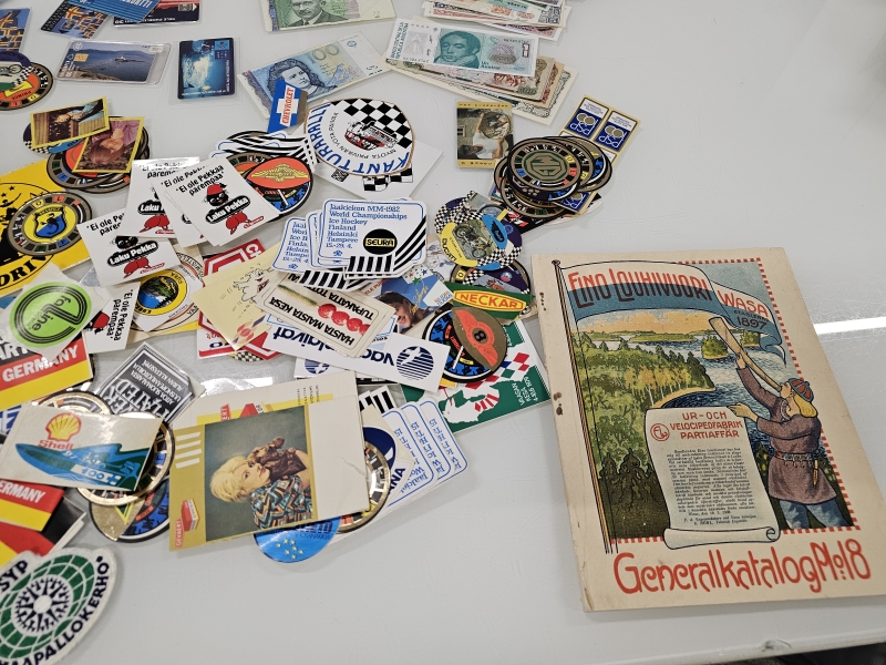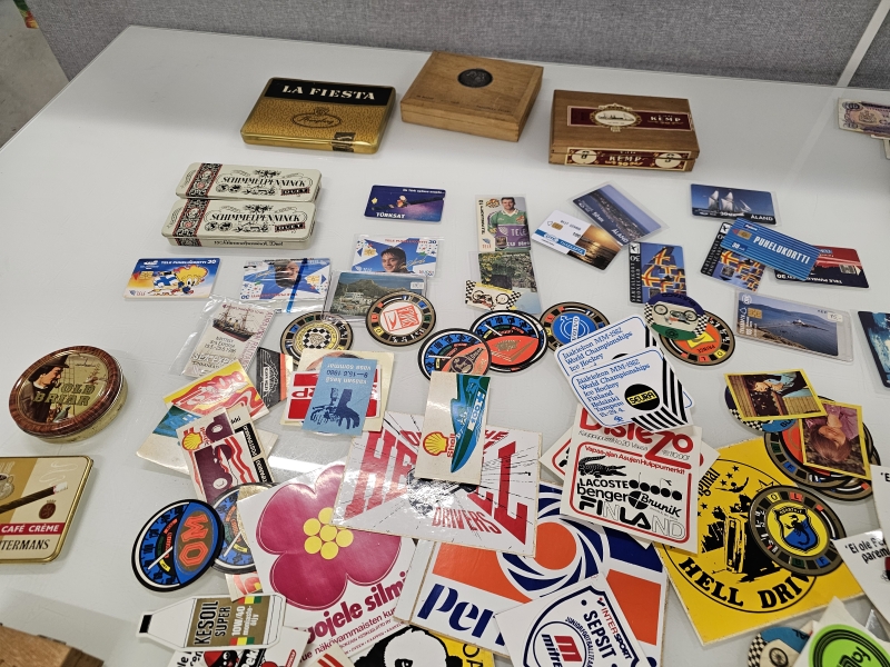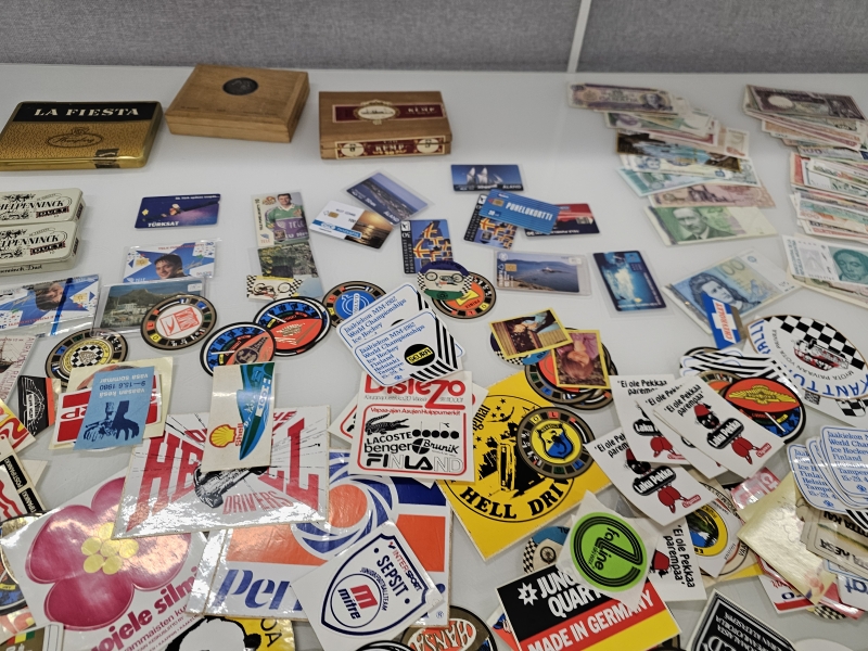 #2399 - Erä puhelukortteja, tarroja ja ulkomaalaisia seteleitä ym.