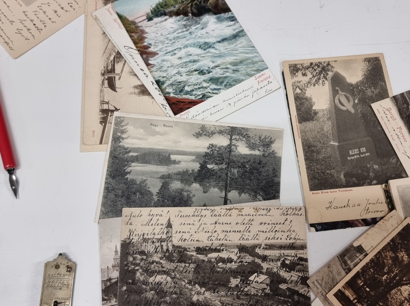 #2516 Vanhoja kortteja, mustekyniä, ym., mm. Suojeluskunta kalvosinnappi