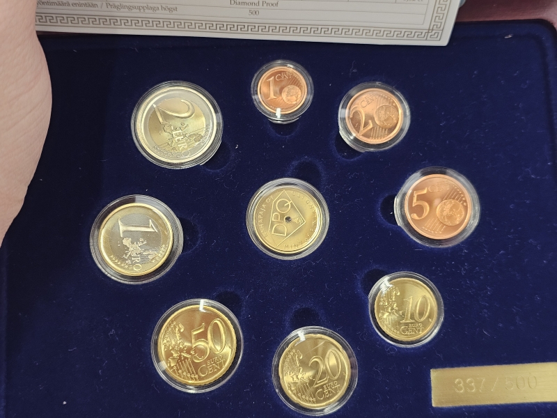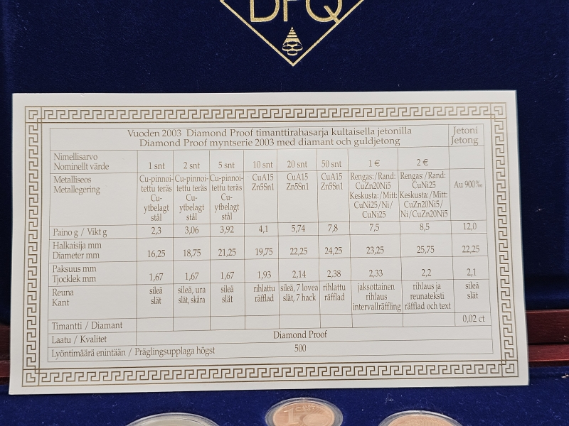 #1327 Kolikkosarja: Vuoden 2003 DPQ sarja kultaisella jetonilla jossa 0,02ct timantti, 12g