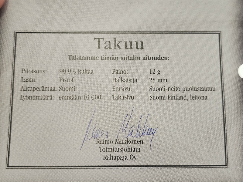 Paino 12g. Pitoisuus 999/1000. Mukana takuutodistus