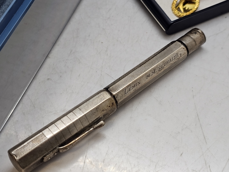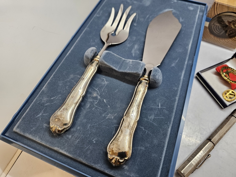 #1338 Hopeinen kynä + hopeiset chippendale kakkuottimet ym.