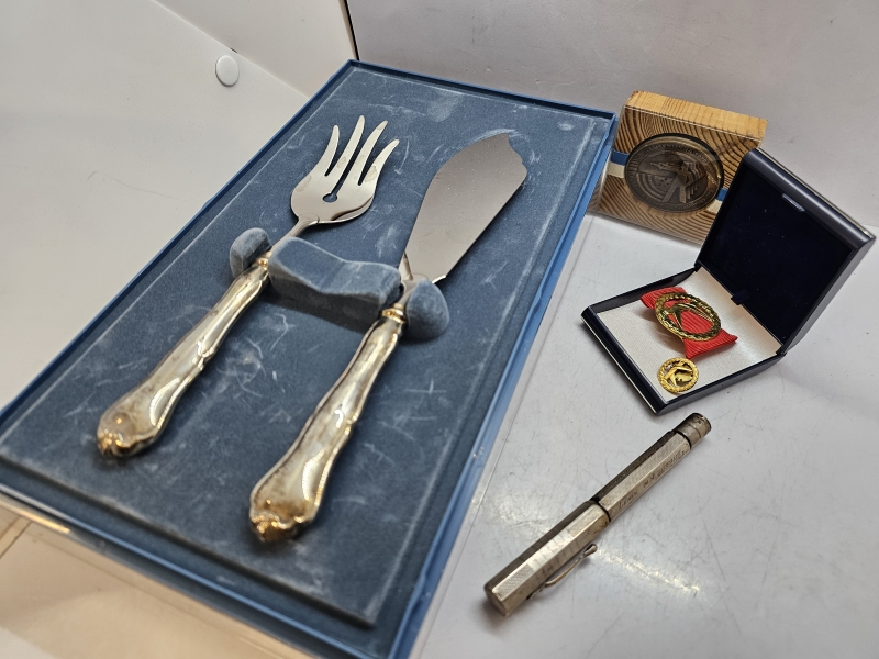 #1338 - Hopeinen kynä + hopeiset chippendale kakkuottimet ym.