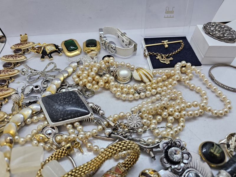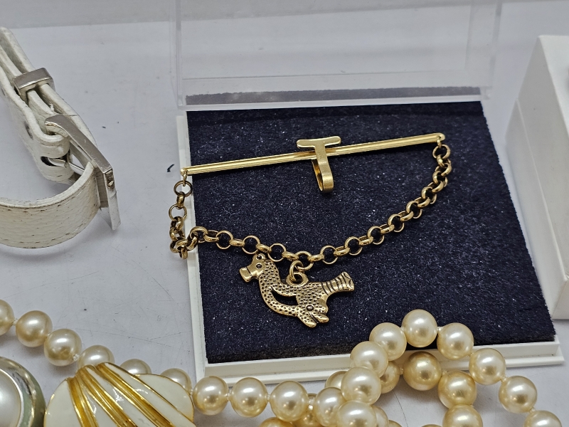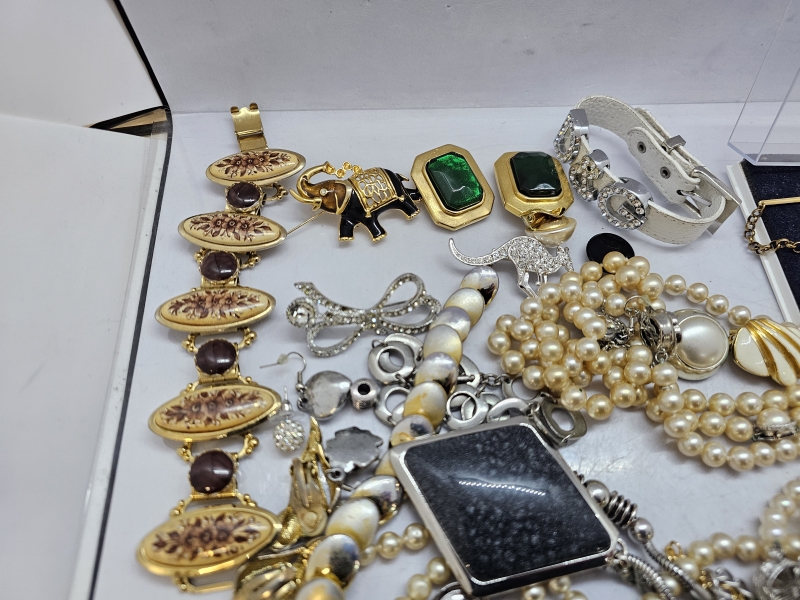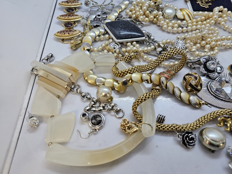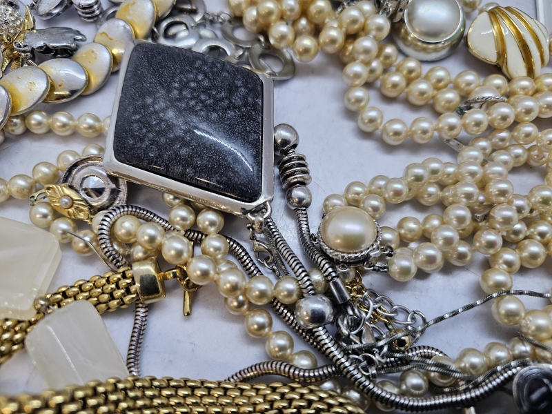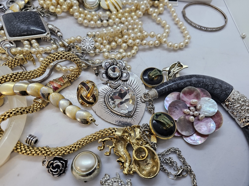 #1339 - Hyvä erä koruja: Mm. Kalevala koru, hopeinen rintaneula ja rannekoru, helmikoruja hopealukoilla