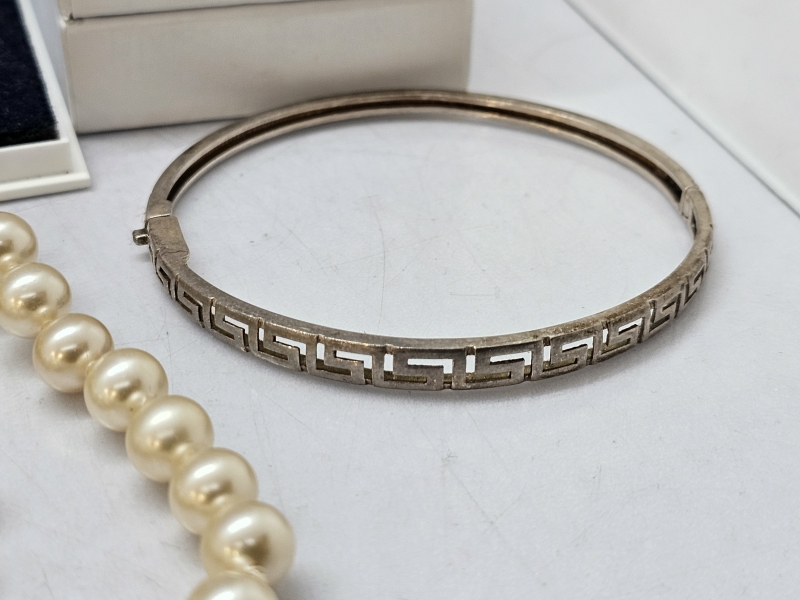#1339 Hyvä erä koruja: Mm. Kalevala koru, hopeinen rintaneula ja rannekoru, helmikoruja hopealukoilla