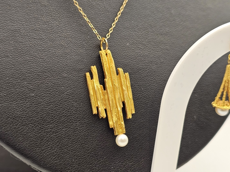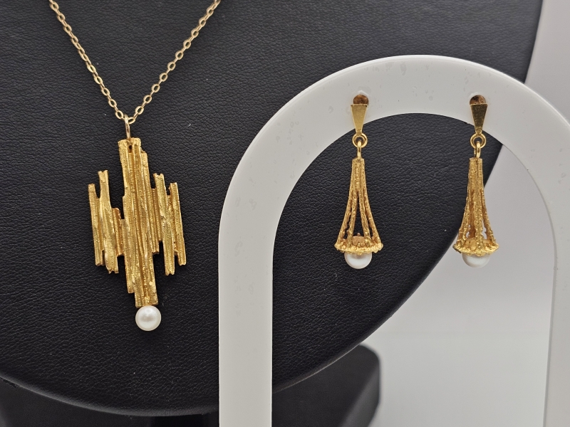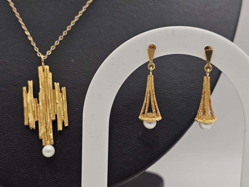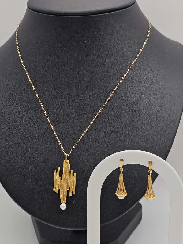 #1346 14k kultainen kaulakoru ja korvakorut helmillä, Tammen koru, 8,58g