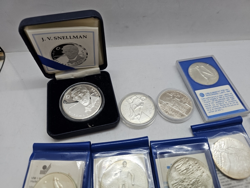 #1379 - Erä kolikoita ja juhlarahoja joista suurin osa hopeaa