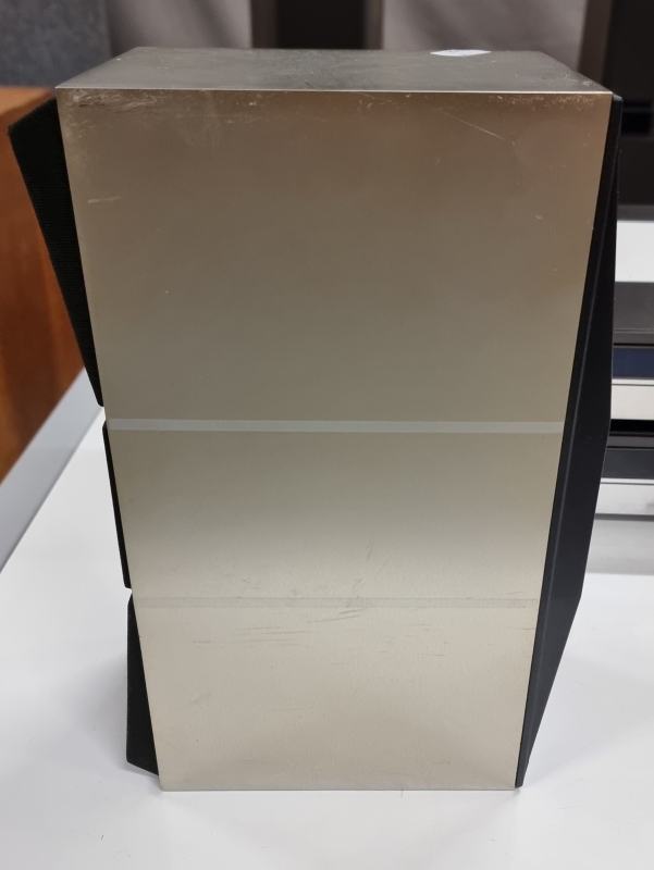 Yhdistelmälaitteisto neljällä kaiuttimella. Vahvistin ei toimi. Isommissa kaiuttimissa pintakolhuja ja kulumaa. K: 150cm