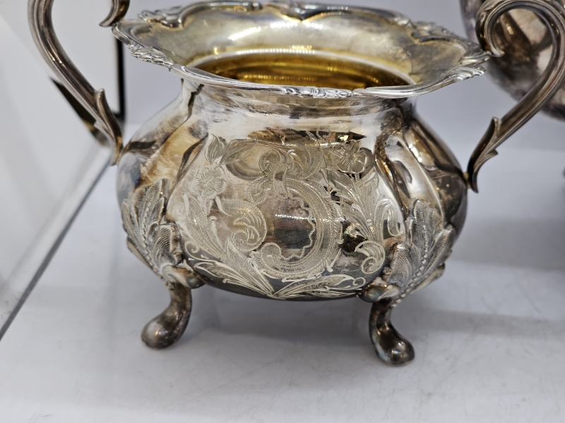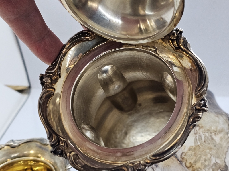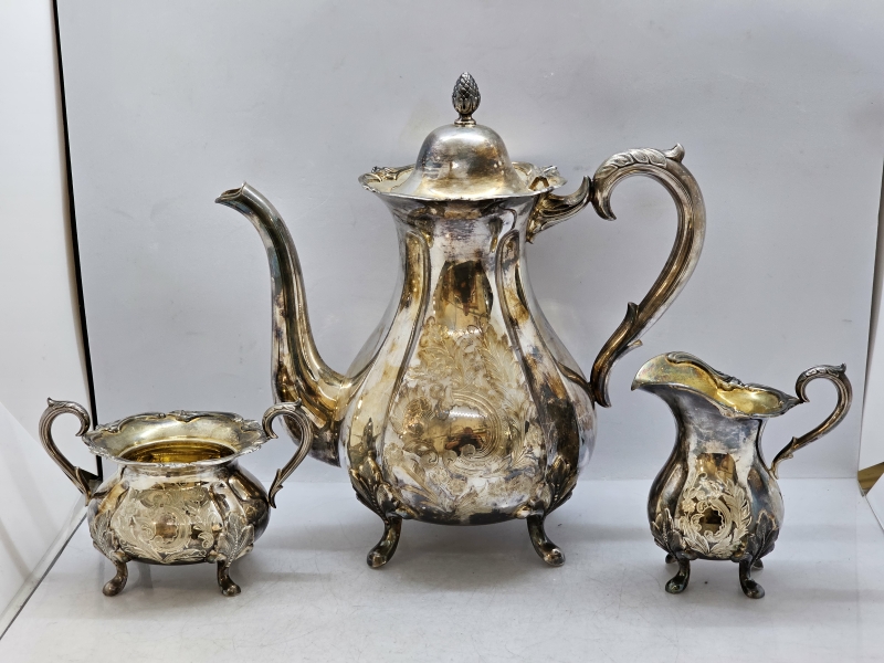 #1432 - Hopeinen kahvikalusto käsinkaiverretuilla koristeilla, 3-osaa