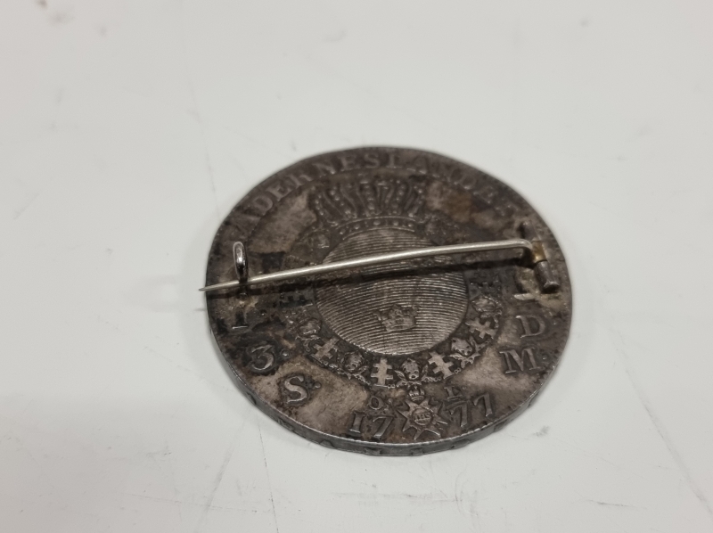 Kolikko tehty rintaneulaksi. Hopeaa: 29g