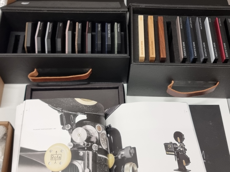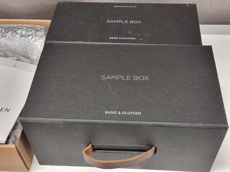 #2341 - Erä Bang & Olufsen tavaraa, mm. seinäkiinnikkeitä, sampleboxeja + 2kpl Genelec kirjoja