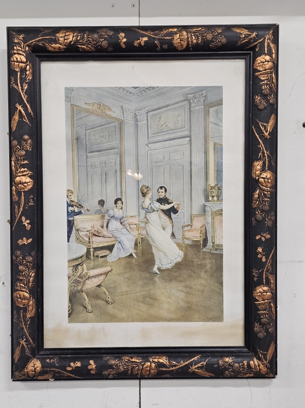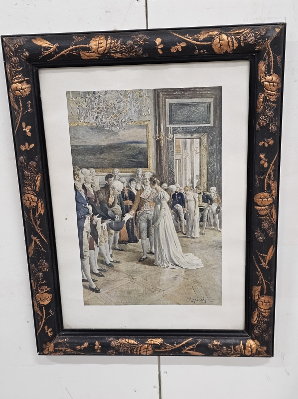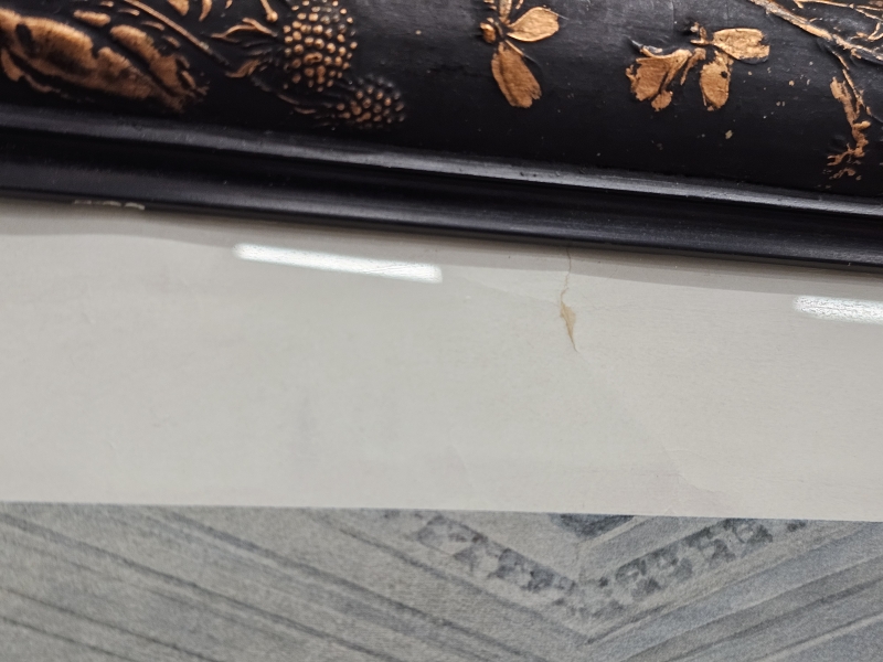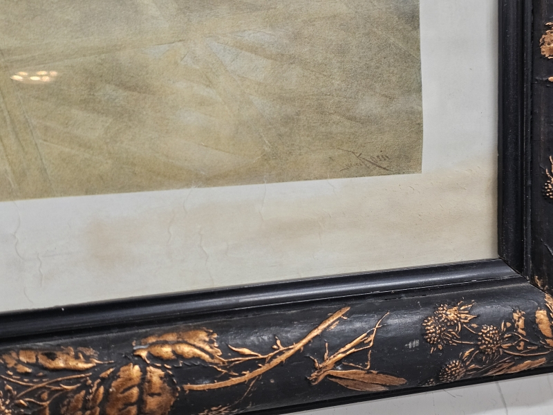 Papereissa kulumaa ja värjäytymää. Kehyksineen 52cm x 67,5m