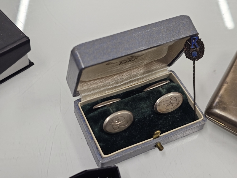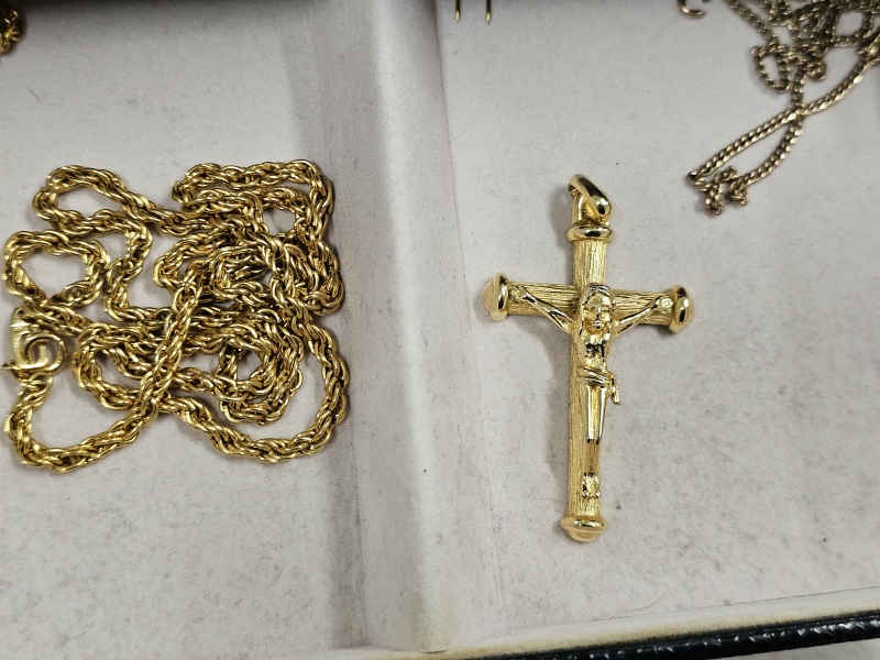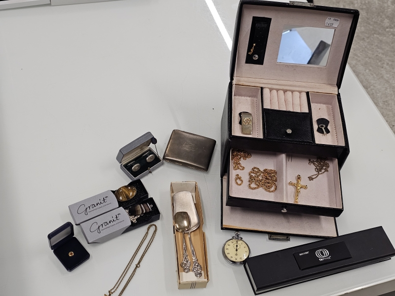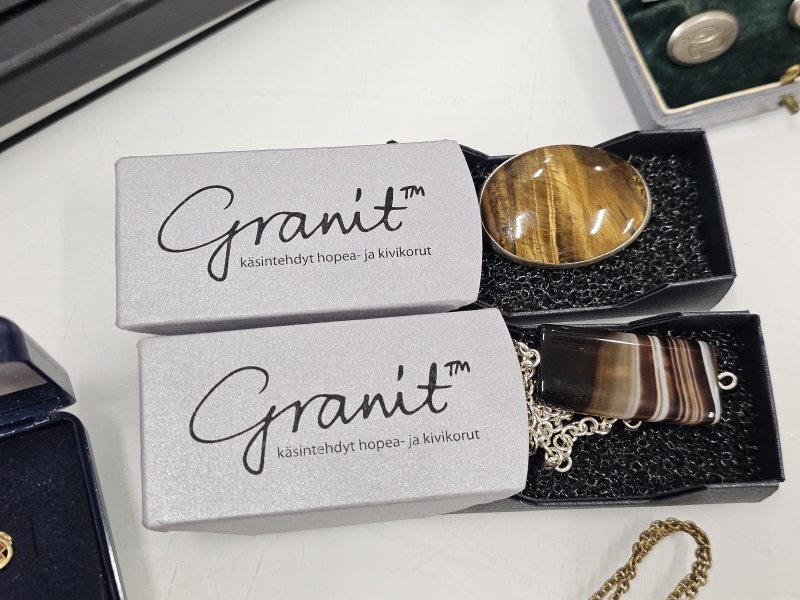 #1030 Erä tavaraa: Mm. Granit hopeakoruja, korurasia, krusifiksi-riipus, taskukello