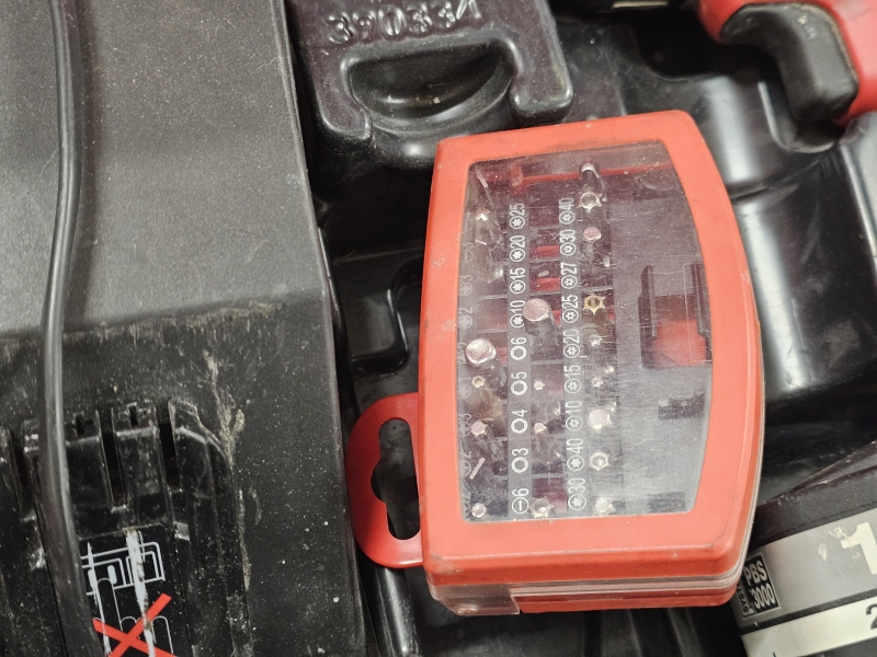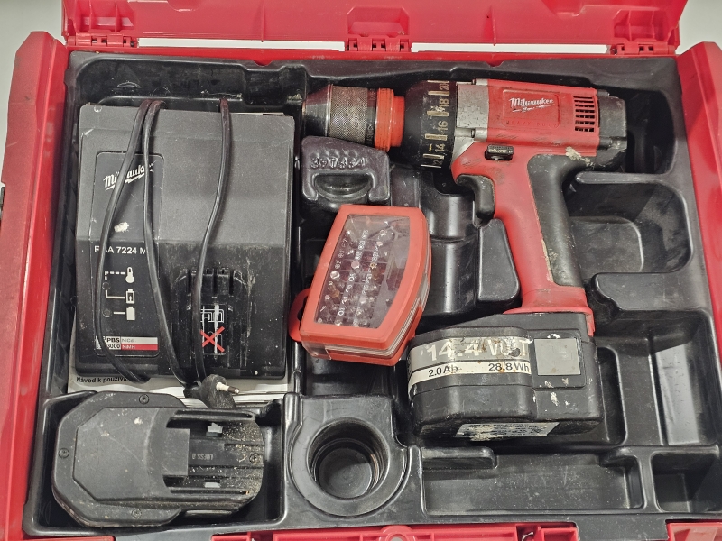 #2532 - Milwaukee akkuporakone + salkku + laturi + 2kpl akkuja ym.