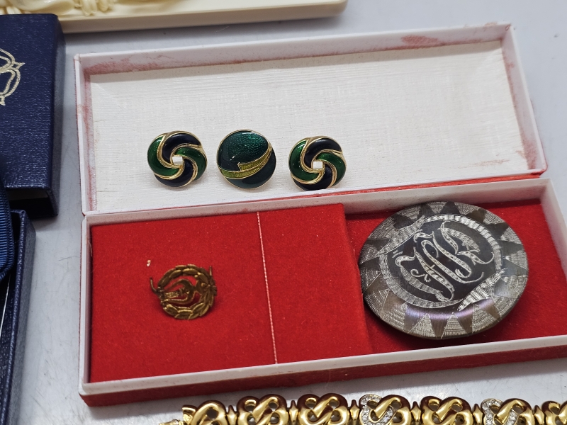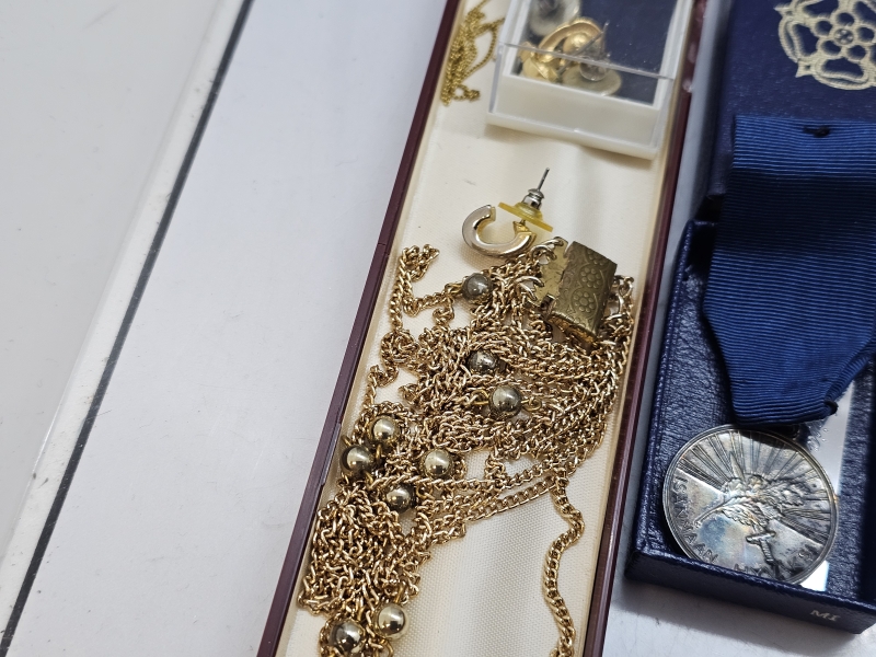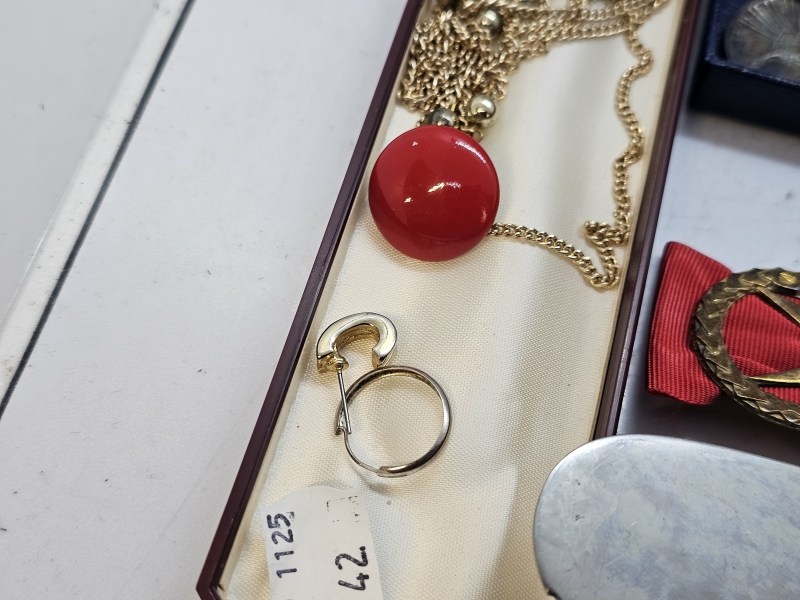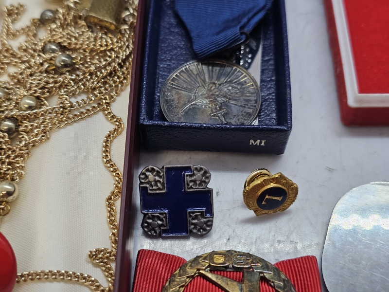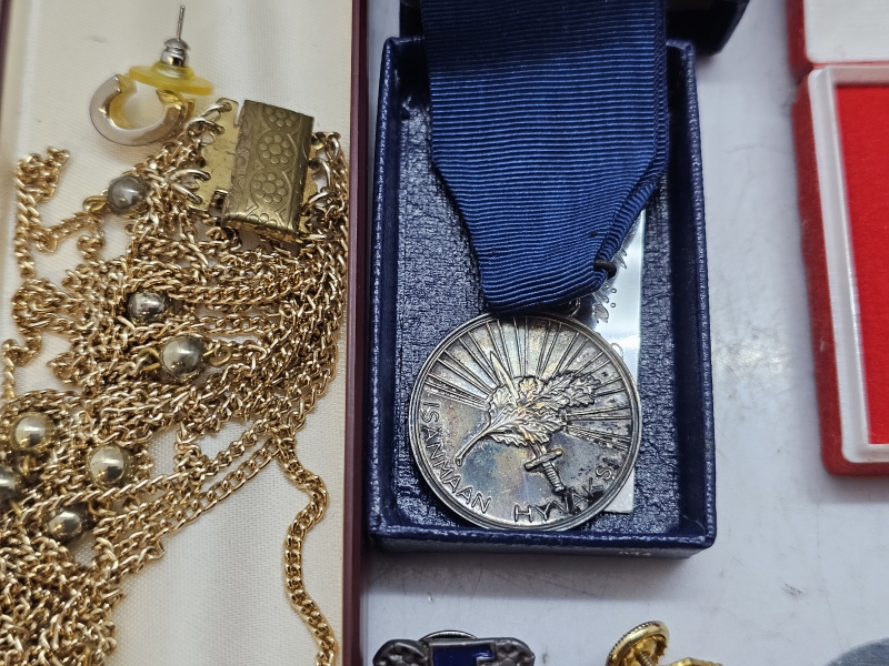 #1462 - Erä koruja, mitaleita, hopeinen kakkulapio ym.