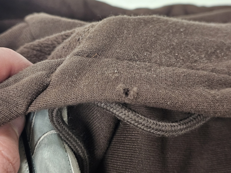 Mukana laatikko, dustbag. Hupun reunassa reikä, likaa