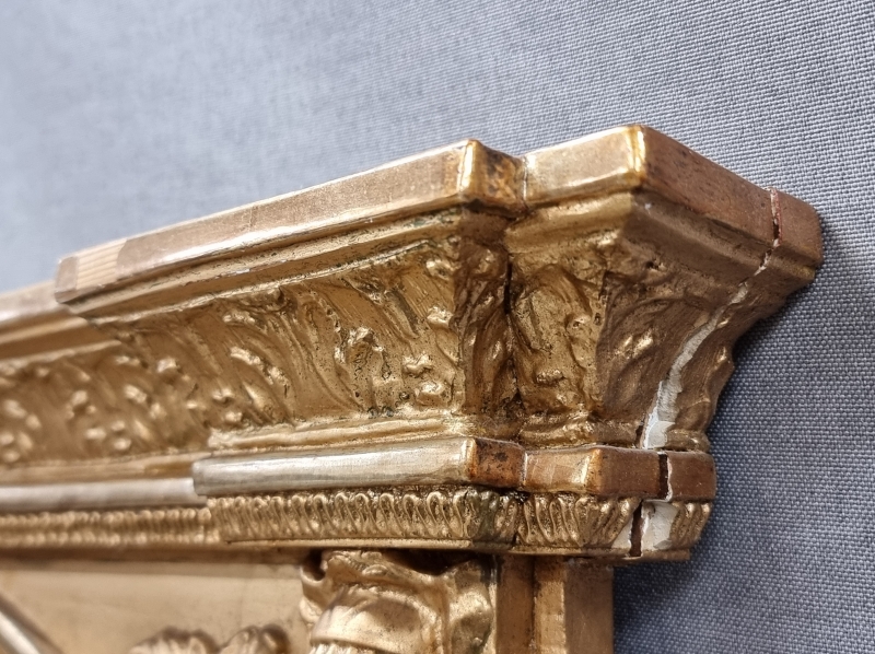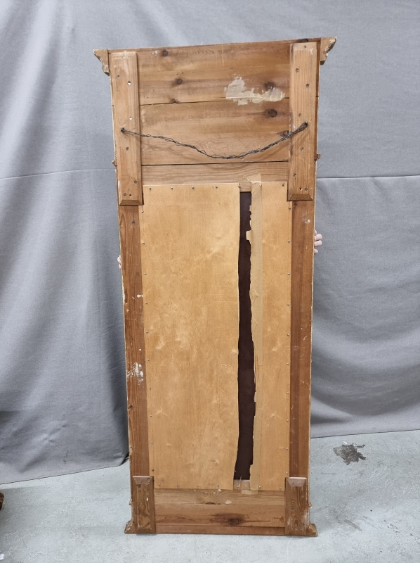 Kultauksissa kulumaa ja puutteita, yläosassa halkeama. L:77cm k:173cm