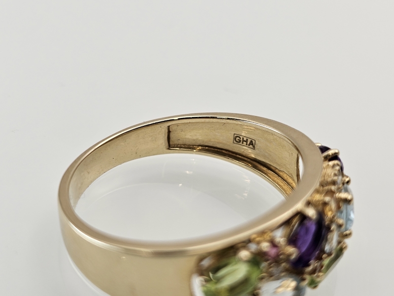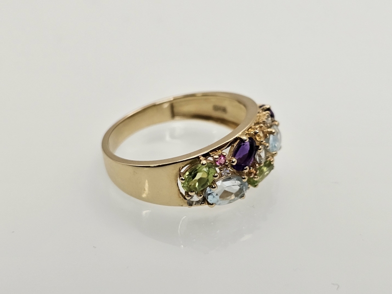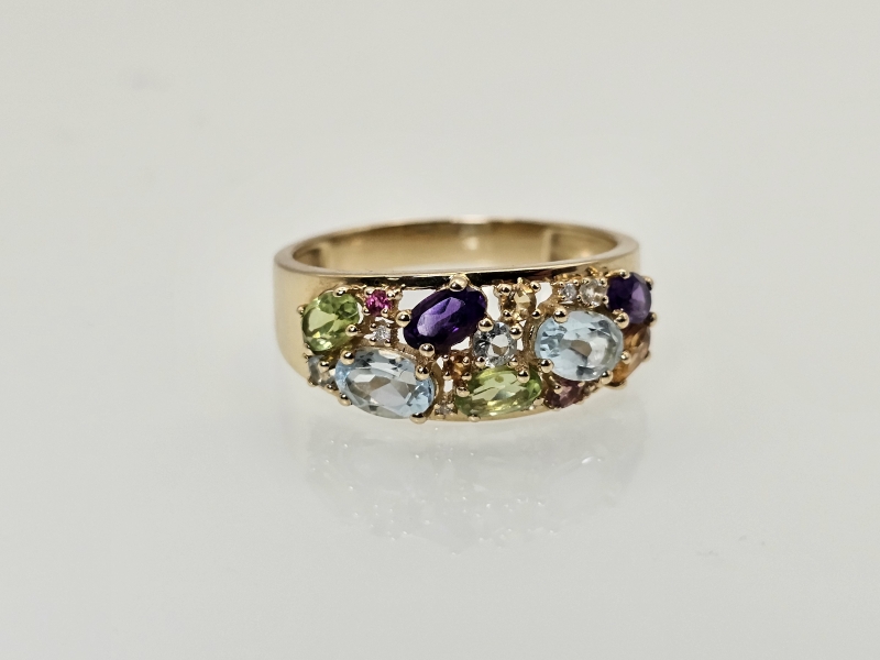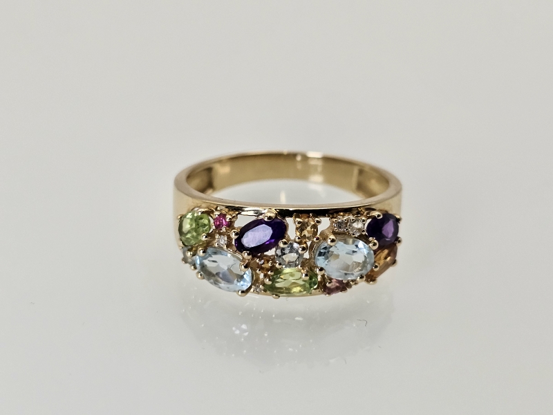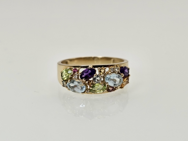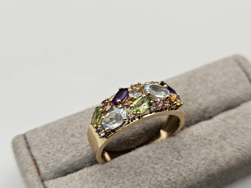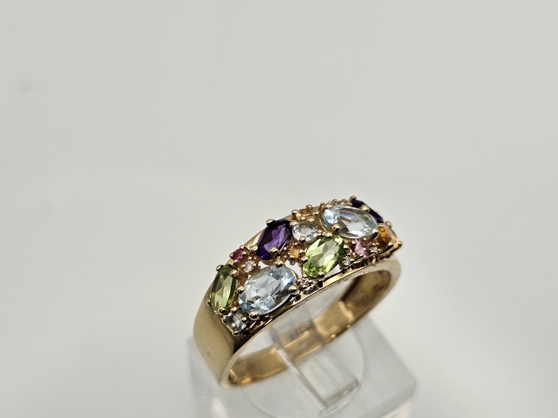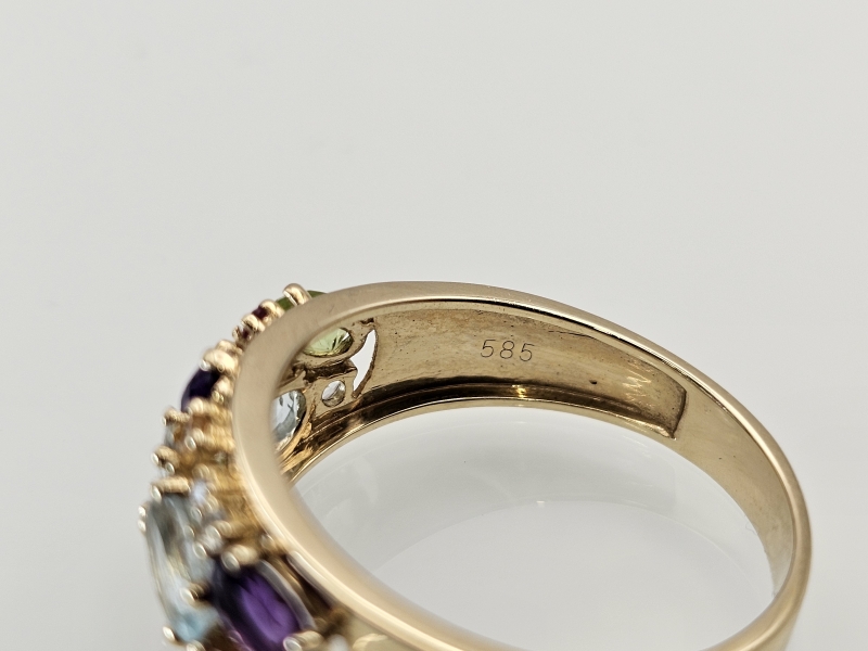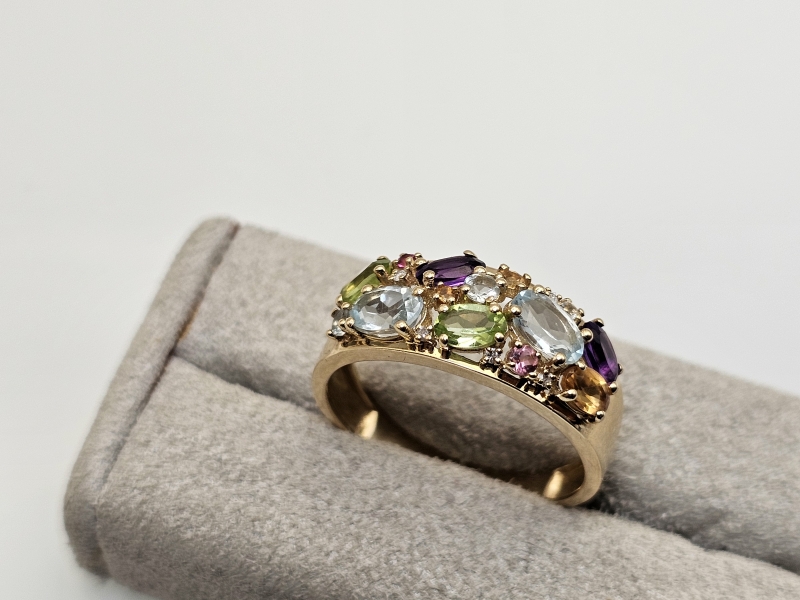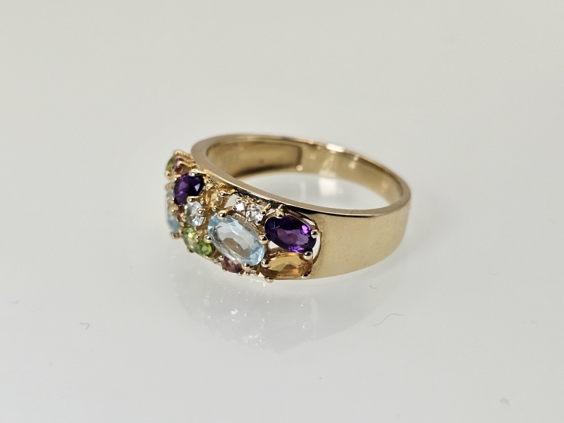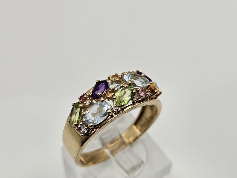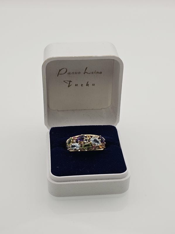 #1474 14k kultainen näyttävä sormus jossa timantit, turmaaliineja, sitriineja, topaaseja ym., 4,59g